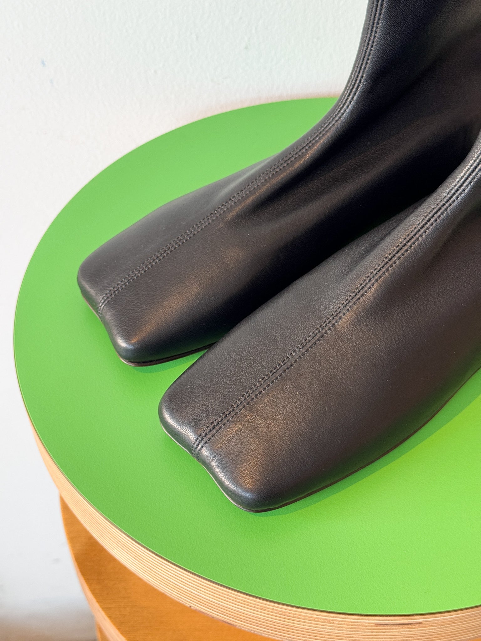 Pull-on "sock" style ankle boots with a minimalist silhouette and sleekness. Made from soft stretch sheep leather. This boot features a softly concave, distinctive toe that has become a signature of aarahee. Inspired by 17th-century French footwear, the shape is reimagined into a modern silhouette with subtle details that reflect the brand’s style and spirit.