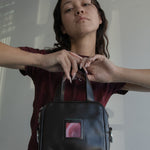 Square mini leather bag in black with a portrait slot in front. Comes with 2 lenticular slides that can be interchanged.