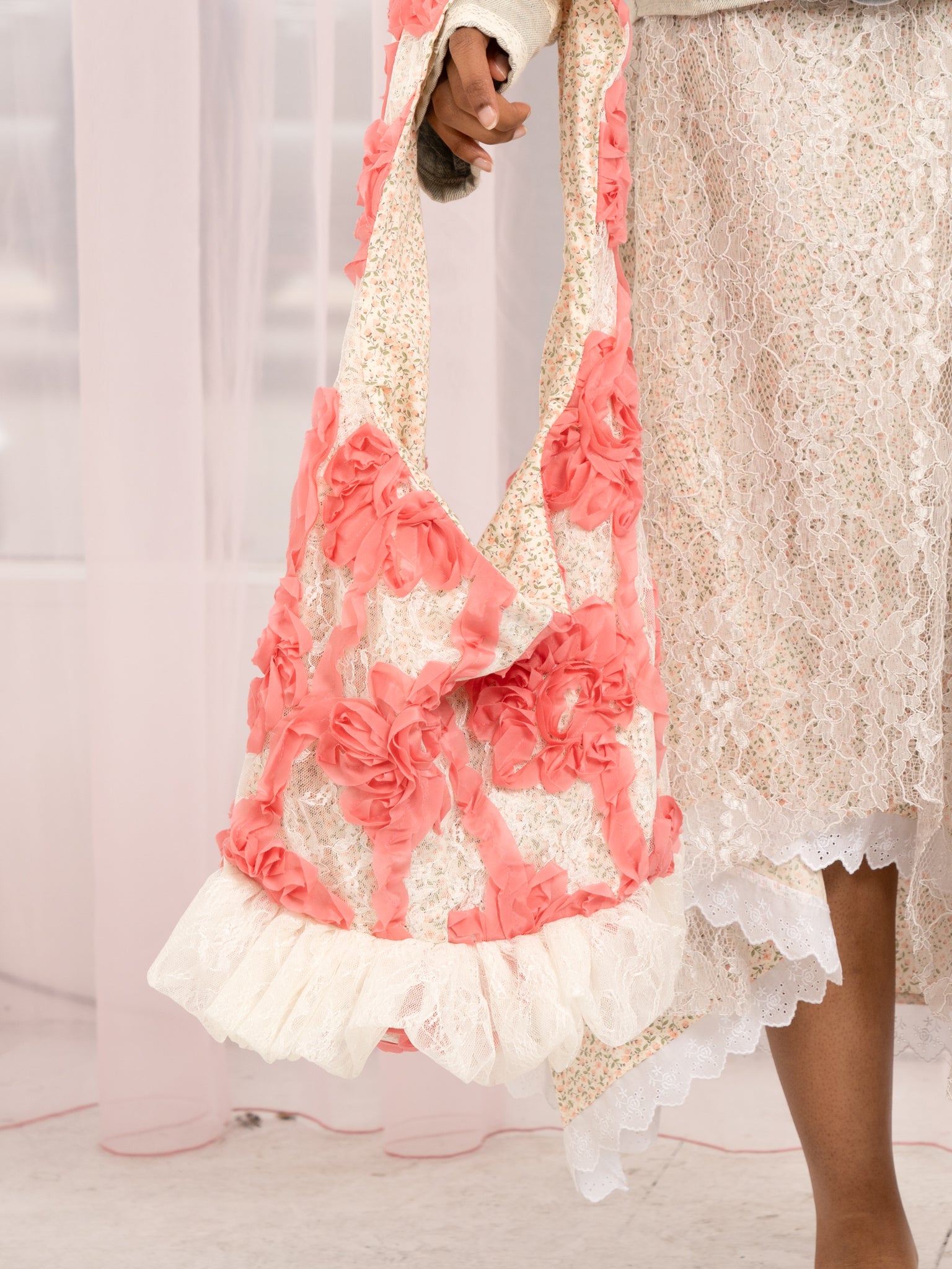 Floral and lace applique bucket tote bag with wide shoulder strap