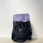 Slim yet structured, a beautiful black leather brief bag lined with lavender leather. Two long rolled top handles for comfortable, padded carrying on your shoulder or in your hands.