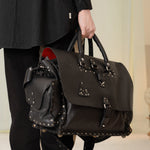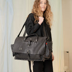 - At base, an aluminum crossbar insert and six brass ball studs help maintain structure and longevity of bag.