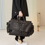 - Exterior has two structured pockets at side of bag with snap closures and one large flap pocket with zipper closure at back