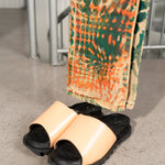 Chunky slides that take comfort and ease as seriously as style. Tan leather upper overlayed on top of a classic Japanese bath slipper!