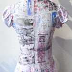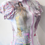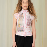 Cap sleeve zip up turtleneck with stenciling on sleeves and graphic illustrations. All pieces by Camila Frater are 1/1 handmade in New York. (Armsleeves not included)