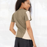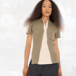Short sleeve t-shirt bodice with ribbed side panels and knit insert on the sleeve featuring the collections signature aran diamond. Open spread collar with vented side seams.