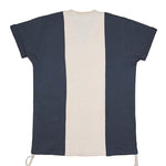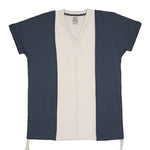 V-neck short sleeve t-shirt bodice with center knitted panel, featuring the collections signature aran diamond. Drawstrings placed along the sides allowing the shirt to be shirred and raise the hem at sides.