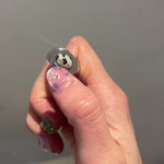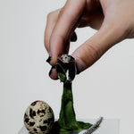 The Quail Egg Ring is a chunky yet minimalistic ring, inspired by a quail egg. Featuring a freely spinning egg-shaped Dalmatian Jasper stone, its designed to be interacted with. Due to the nature of each stone, expect slight variations from the pictures listed.