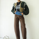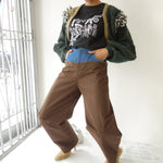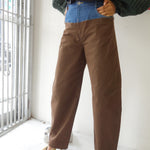 Contrast jean trousers, made from Okayama denim and chocolate brown chinos from Kurashiki-dyed organic cotton. Slightly curved leg silhouette.