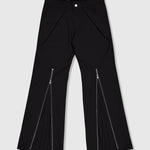 Straight cut nylon twill trousers with zippered legs that reveal pleated flares.