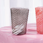Hand blown organic hexagon shaped cups with a swirly pattern made on his mobile furnace by glassblower Arthur Wilson in Mableton, Georgia.