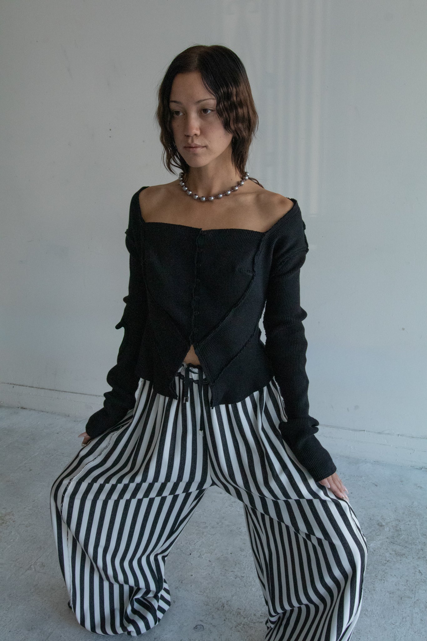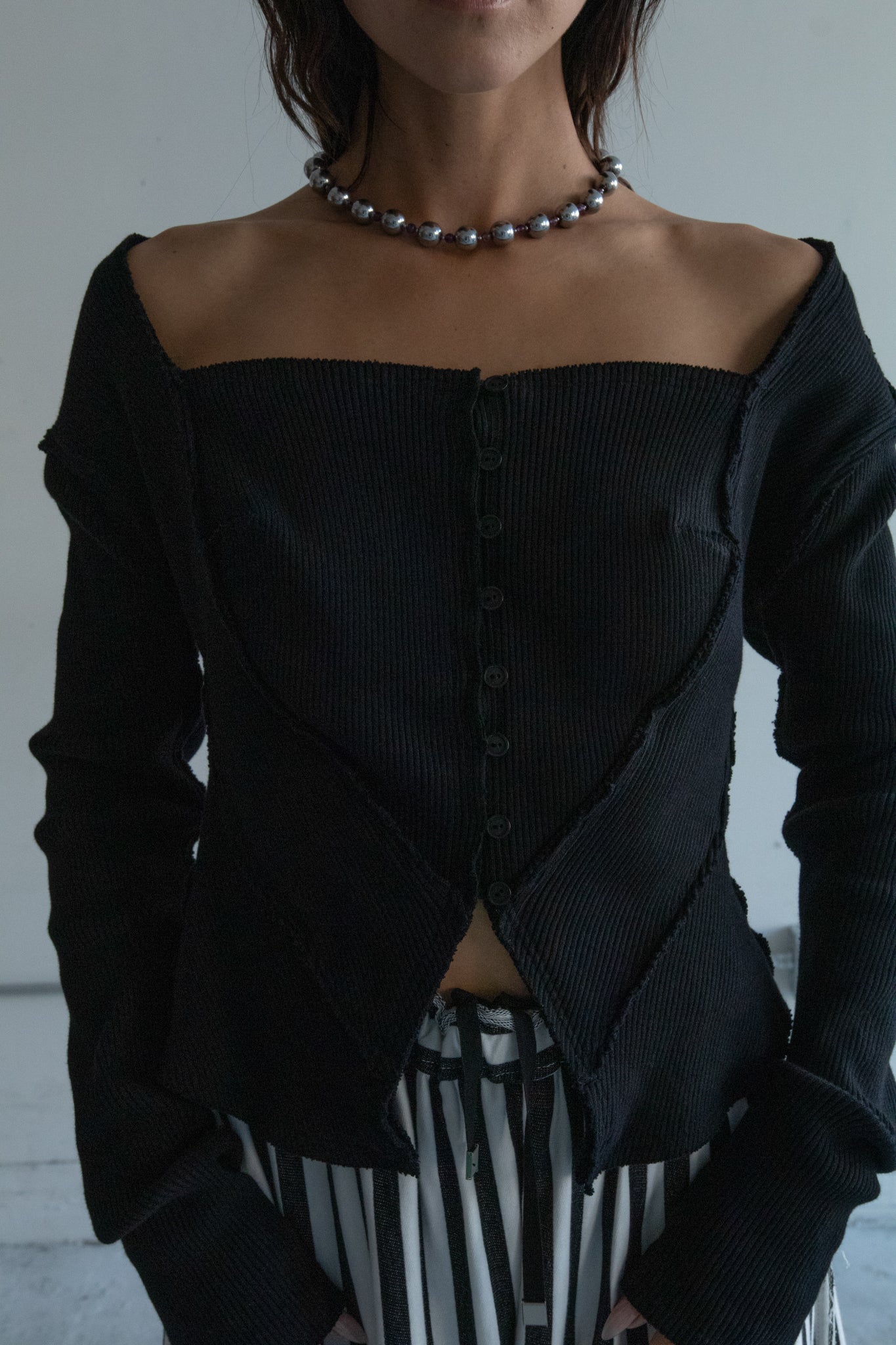 Stretch cotton ribbed square neck cardigan with exposed seams in fitted corset style; button and loop closures.