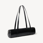 Elongated high shine leather bolter bag style with double strap and zip detail. Snap button detail can be custom to adjust the length of the straps. Fully lined.