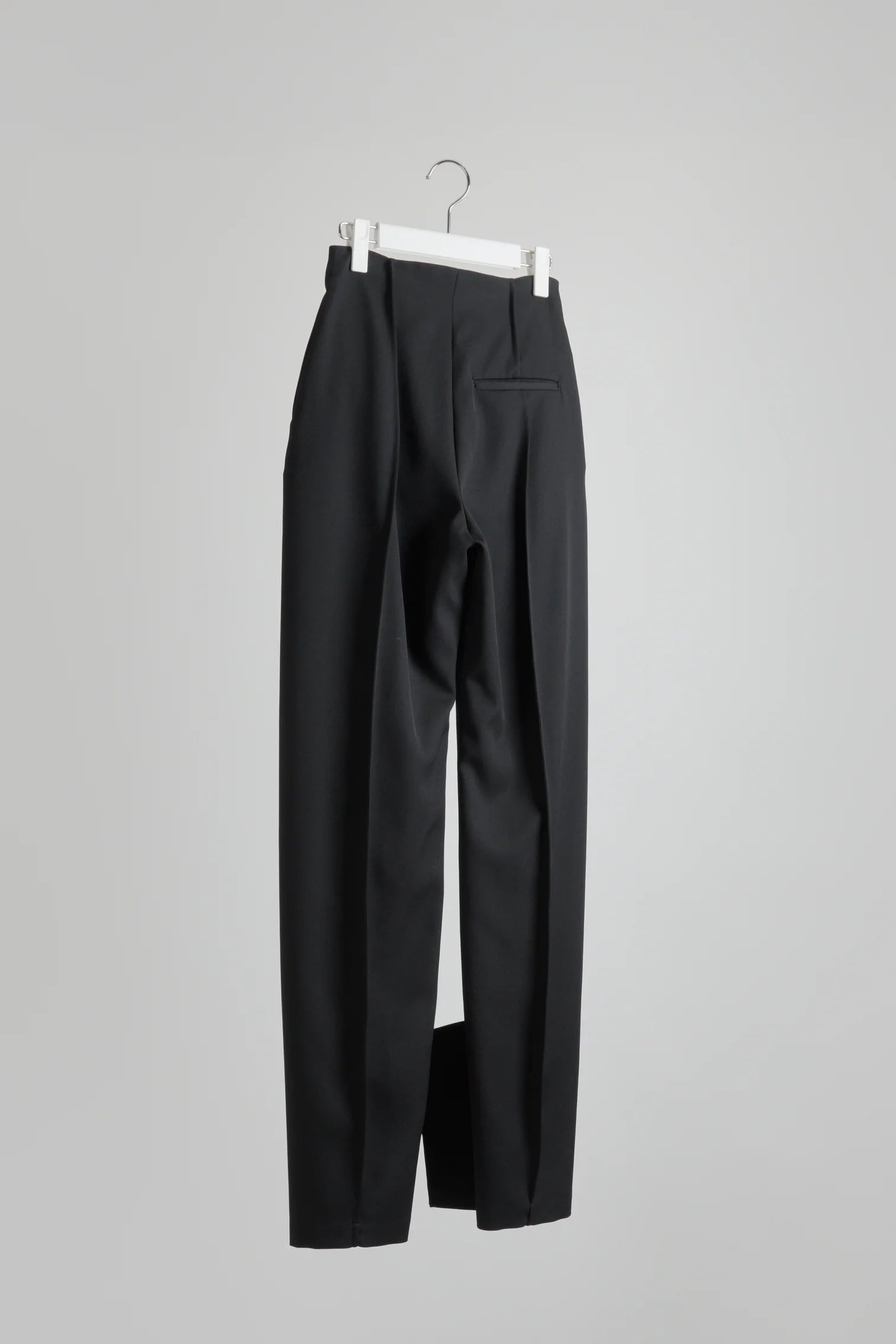 The "Church" trousers are Yohei Ohno's signature pant silhouette of the season. The style is designed so that the toe of the shoes peek out from the slit at the overhanging square hem, named as such as the design resembles the entrance of a church. The shape is slightly thicker, straight silhouette. The material used is wool twill with a resin finish and a taut feel.