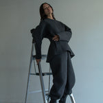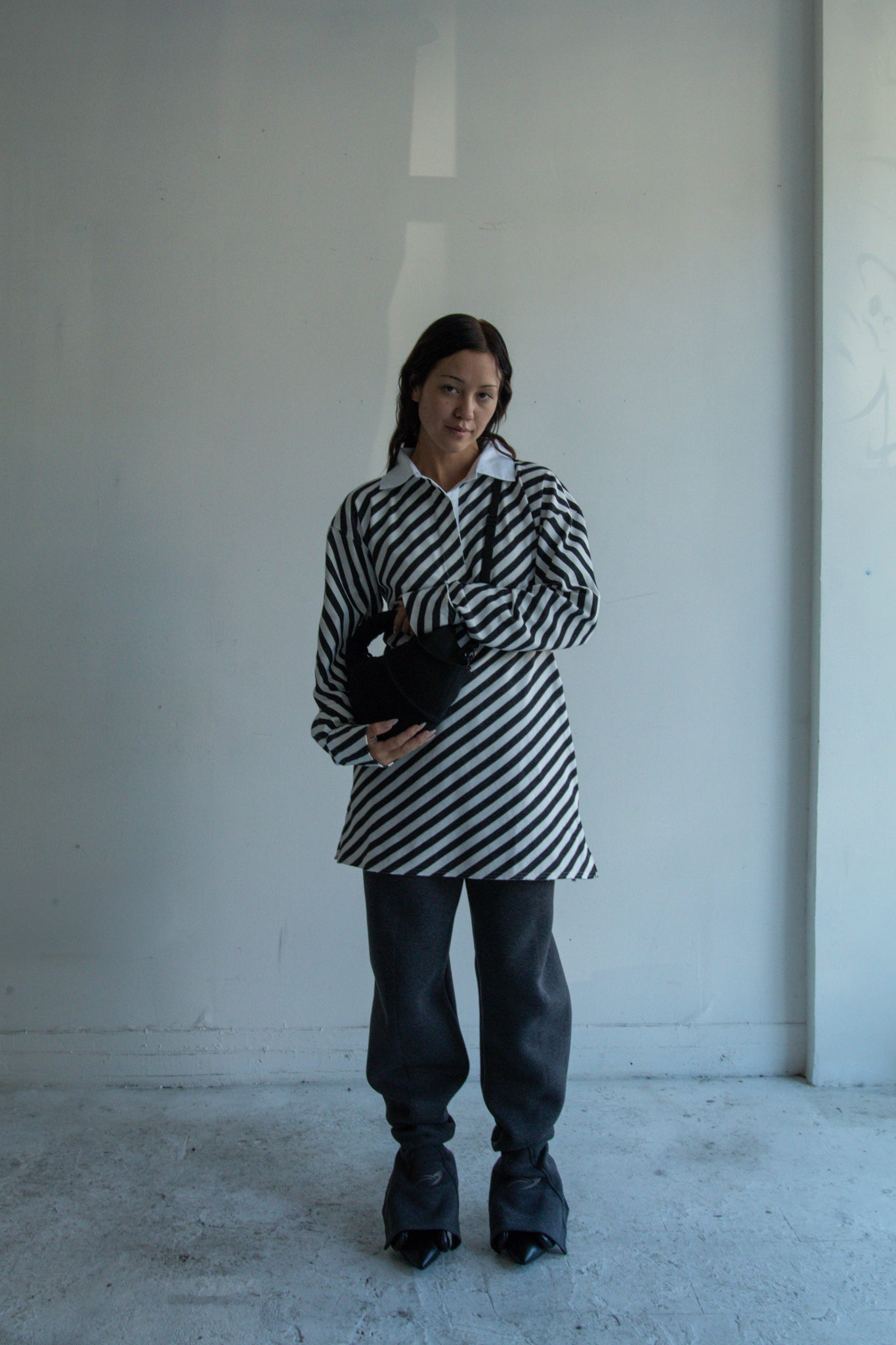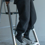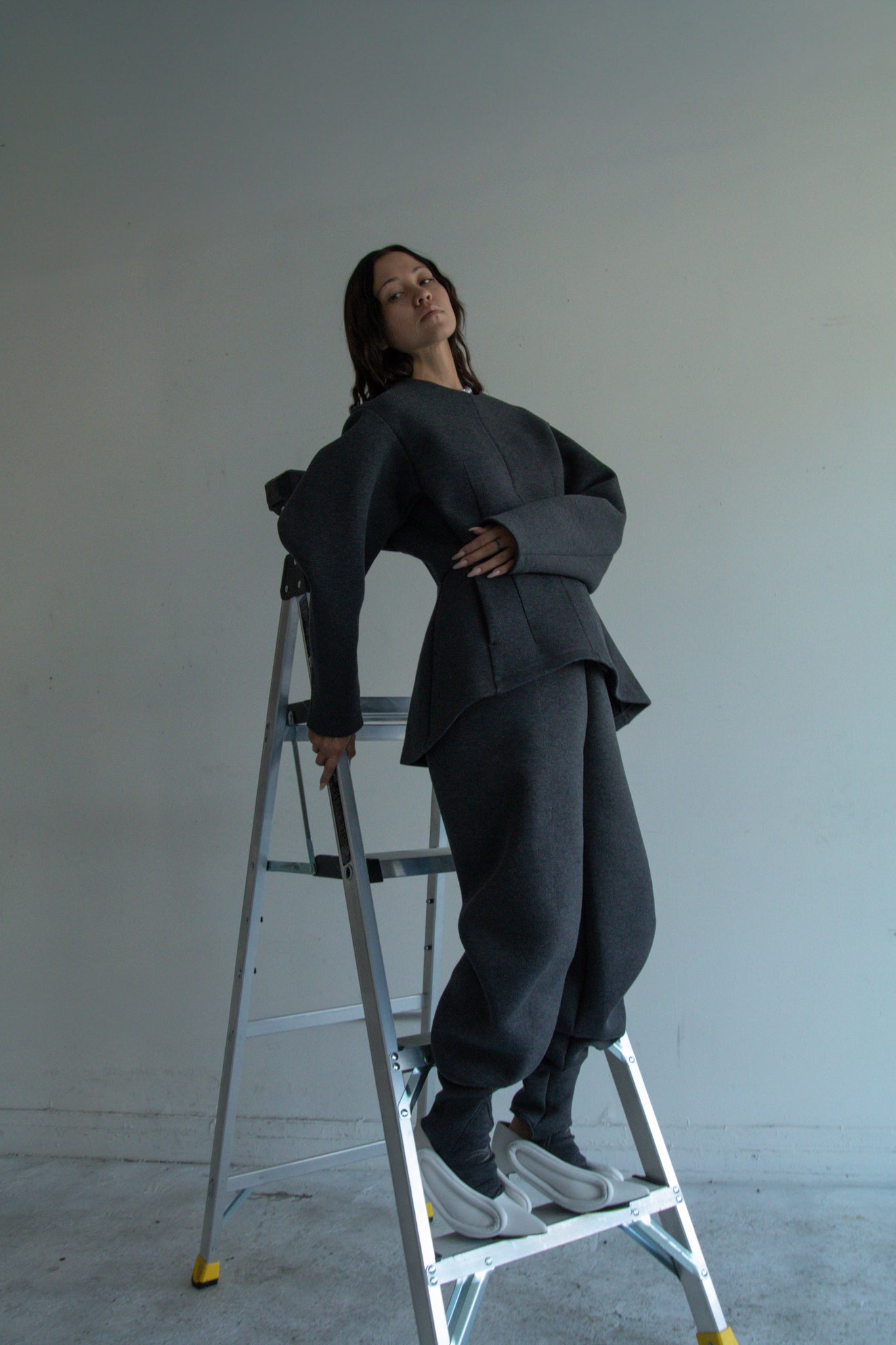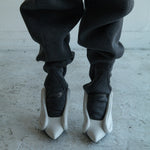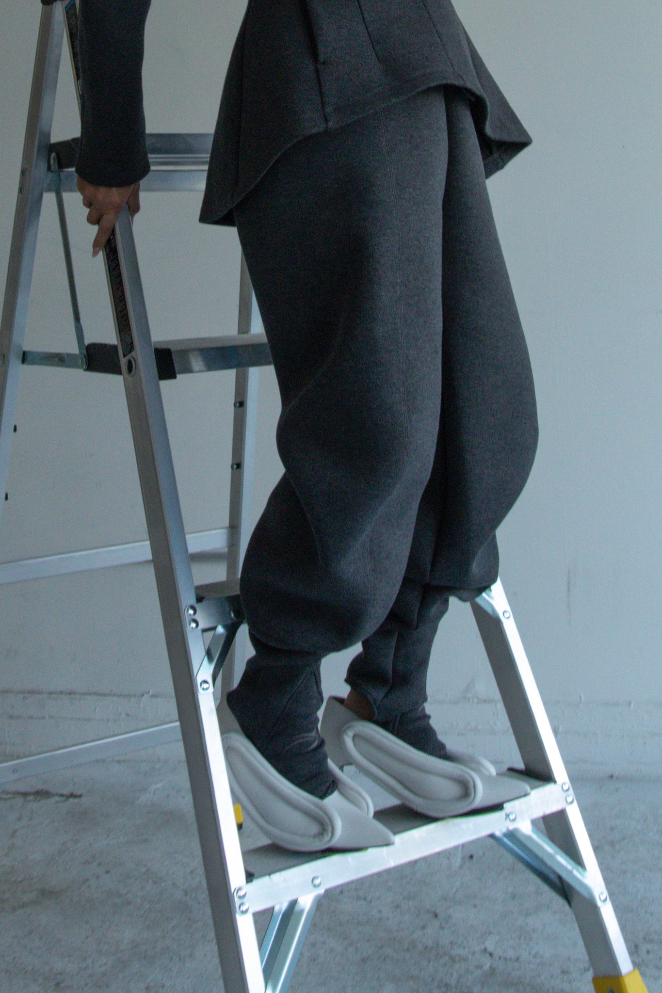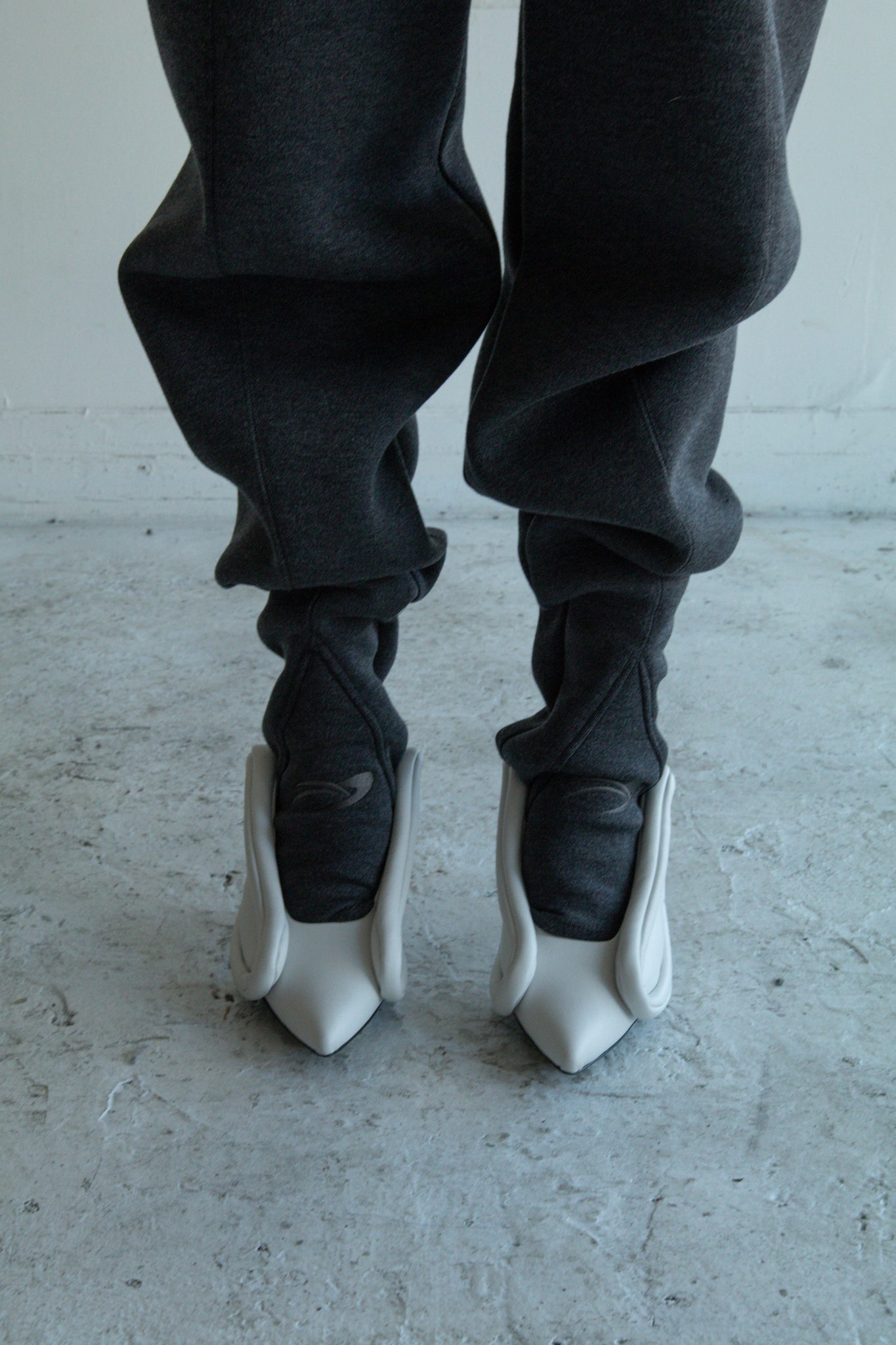 Part of the collection's “Sculptural Relaxed Wear” concept series, these semi-structured 'cardboard' jersey pants have stirrups that wrap around the instep. The instep is embroidered with a sports logo. In addition, Velcro tapes are attached to the soles of the legs, making it possible to wear them without wrapping around the feet.