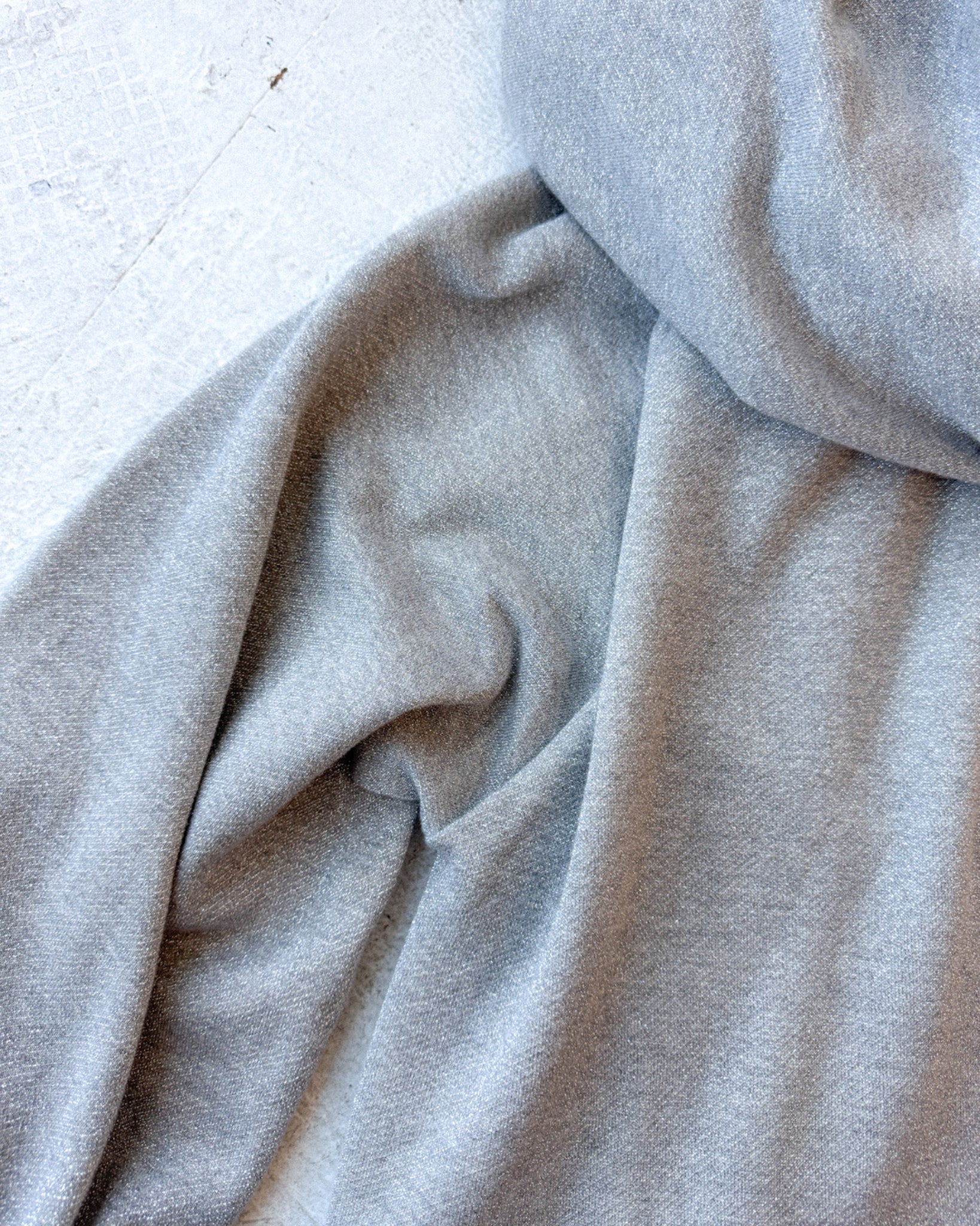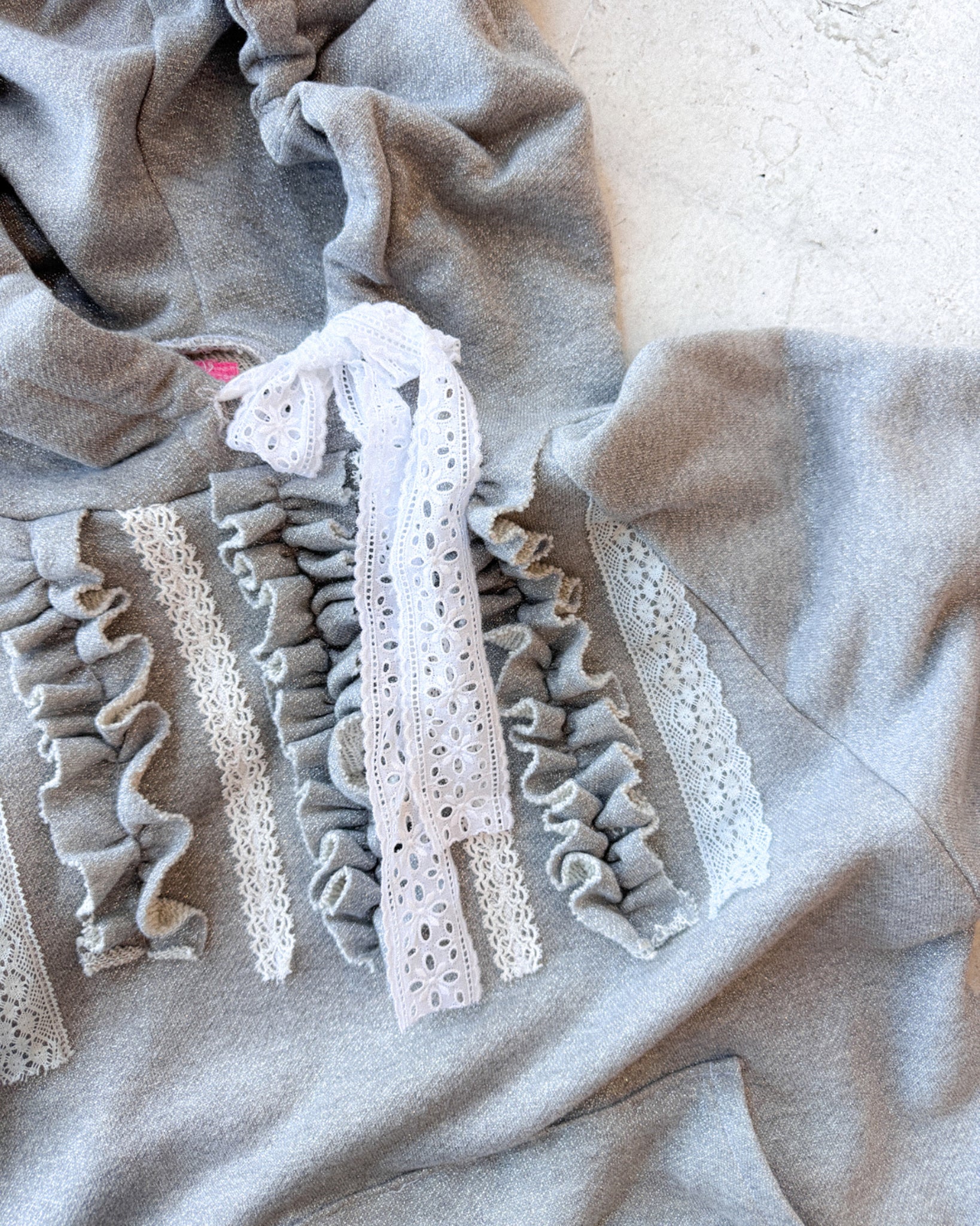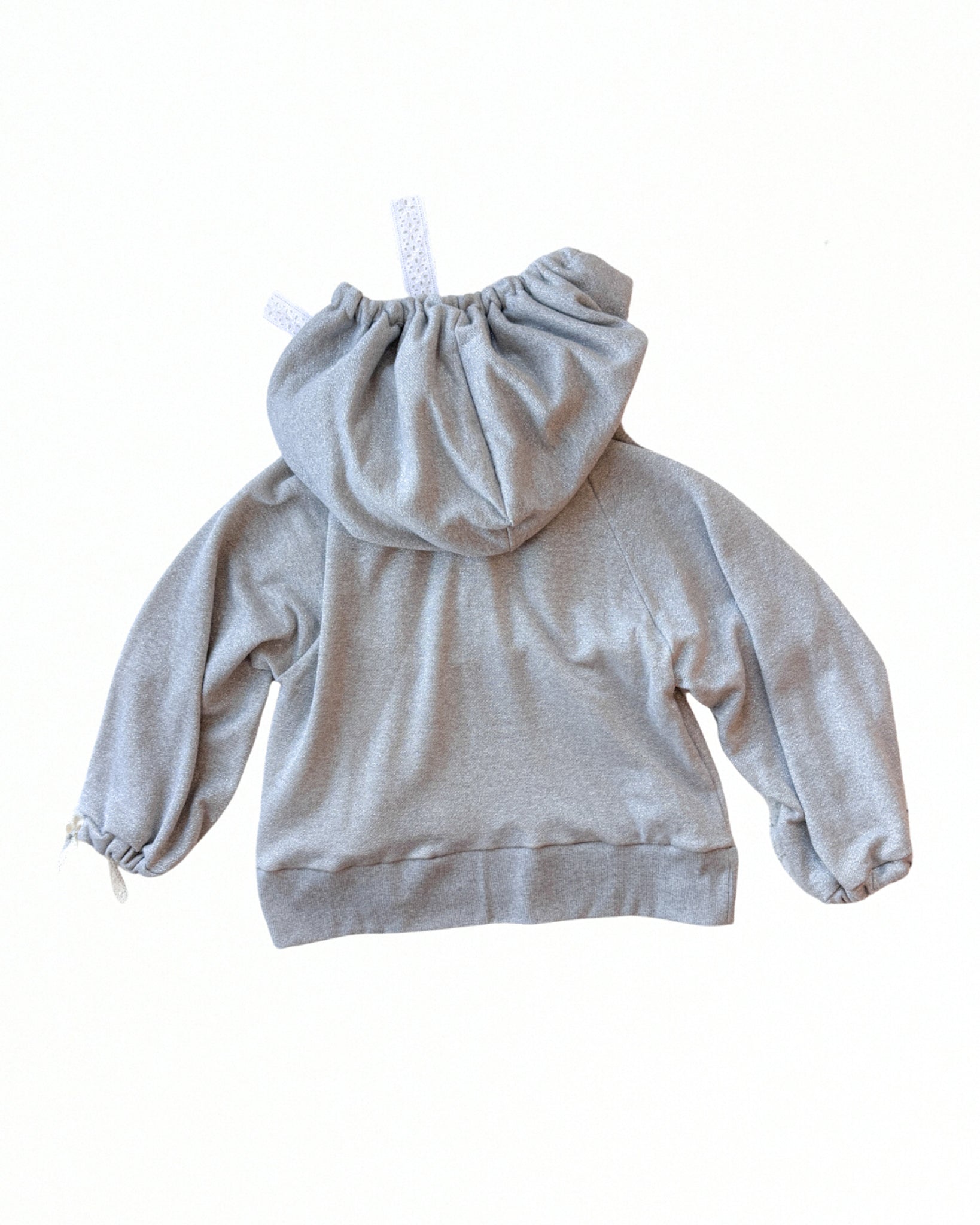 Relaxed, slouchy gray hoodie with extra oversized hood and front chest detail. Ribbon cuffs and drawstring closure. Unisex and easy to wear, with a sculptural sense of comfort.