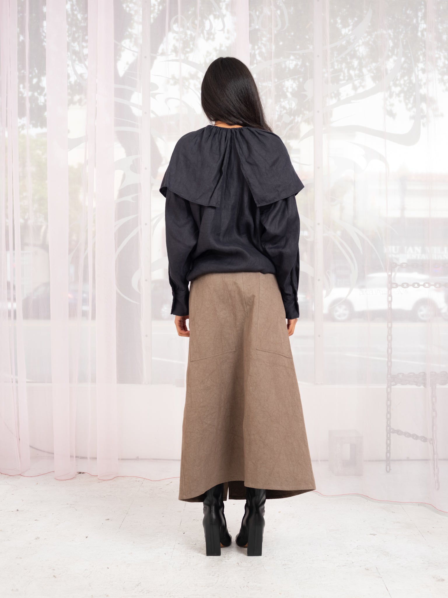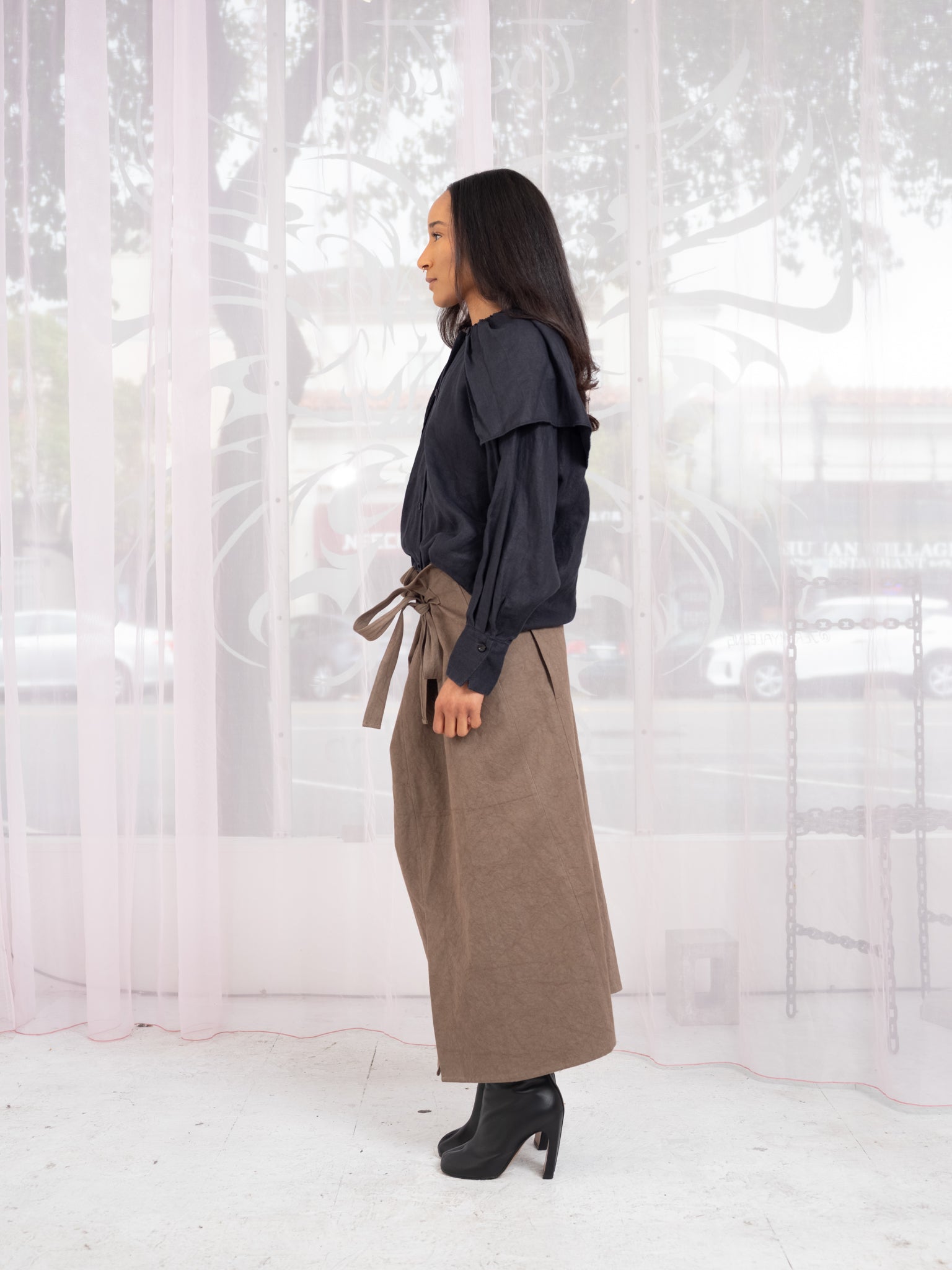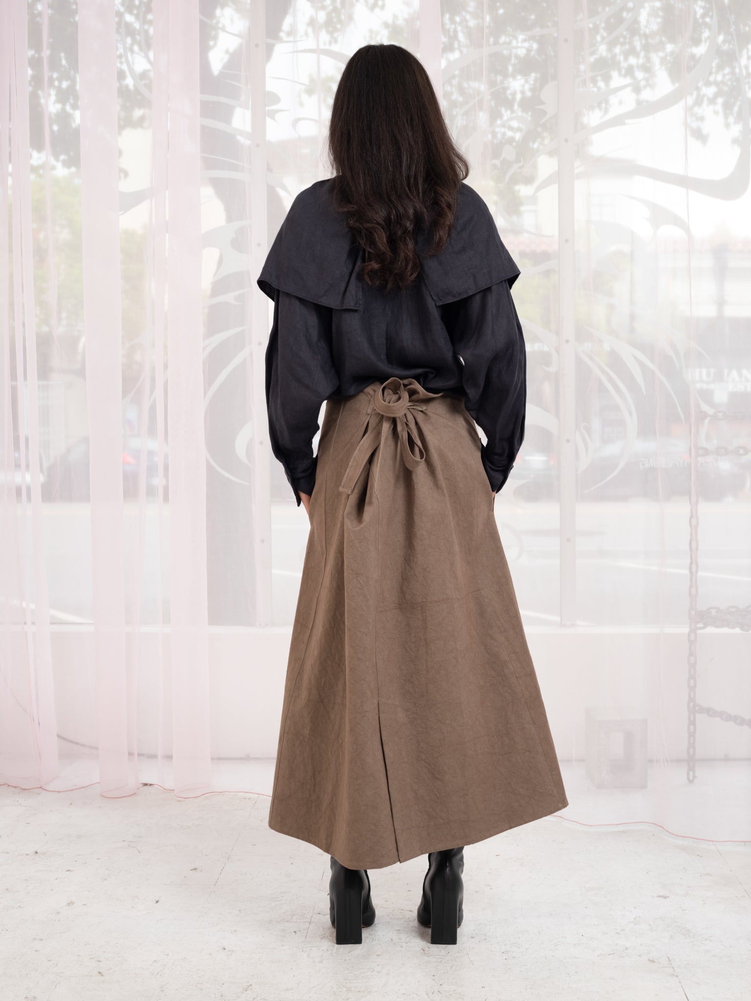 Straight a-line brown skirt with adjustable wrap waist ties. Two large pockets. Skirt can be worn with pockets at back or in front. Front slit.