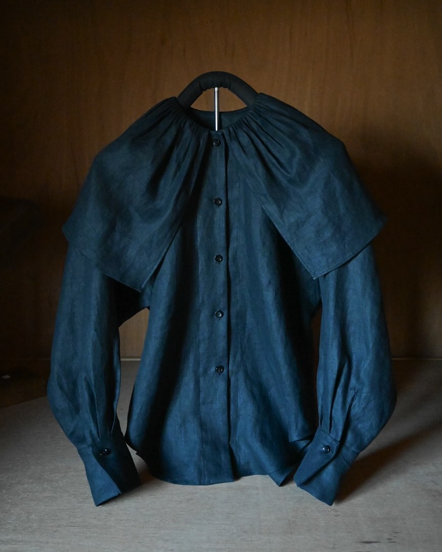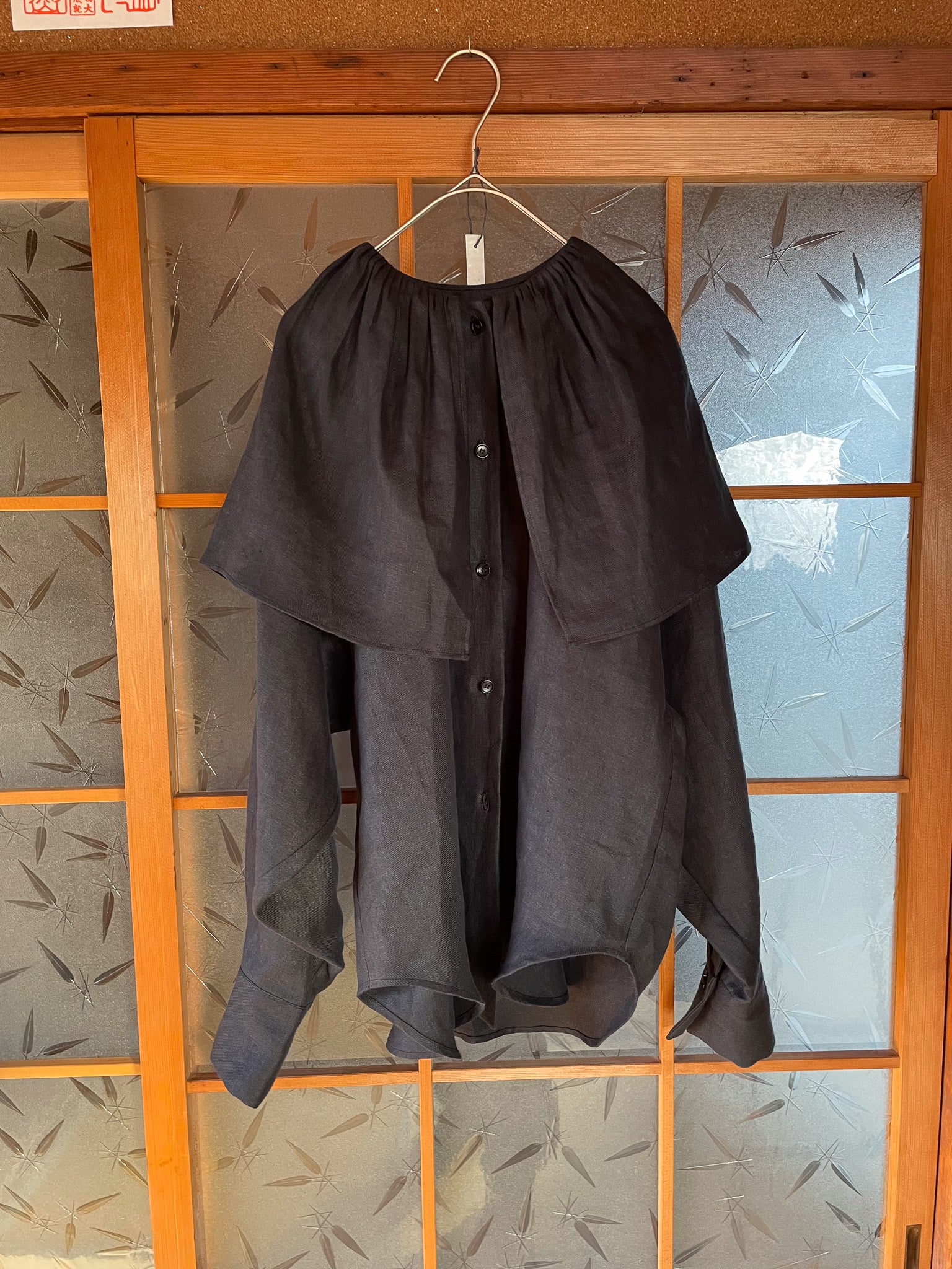 Washed black slouchy button up shirt made from 100% French linen woven in Japan. Oversized pleated collar.