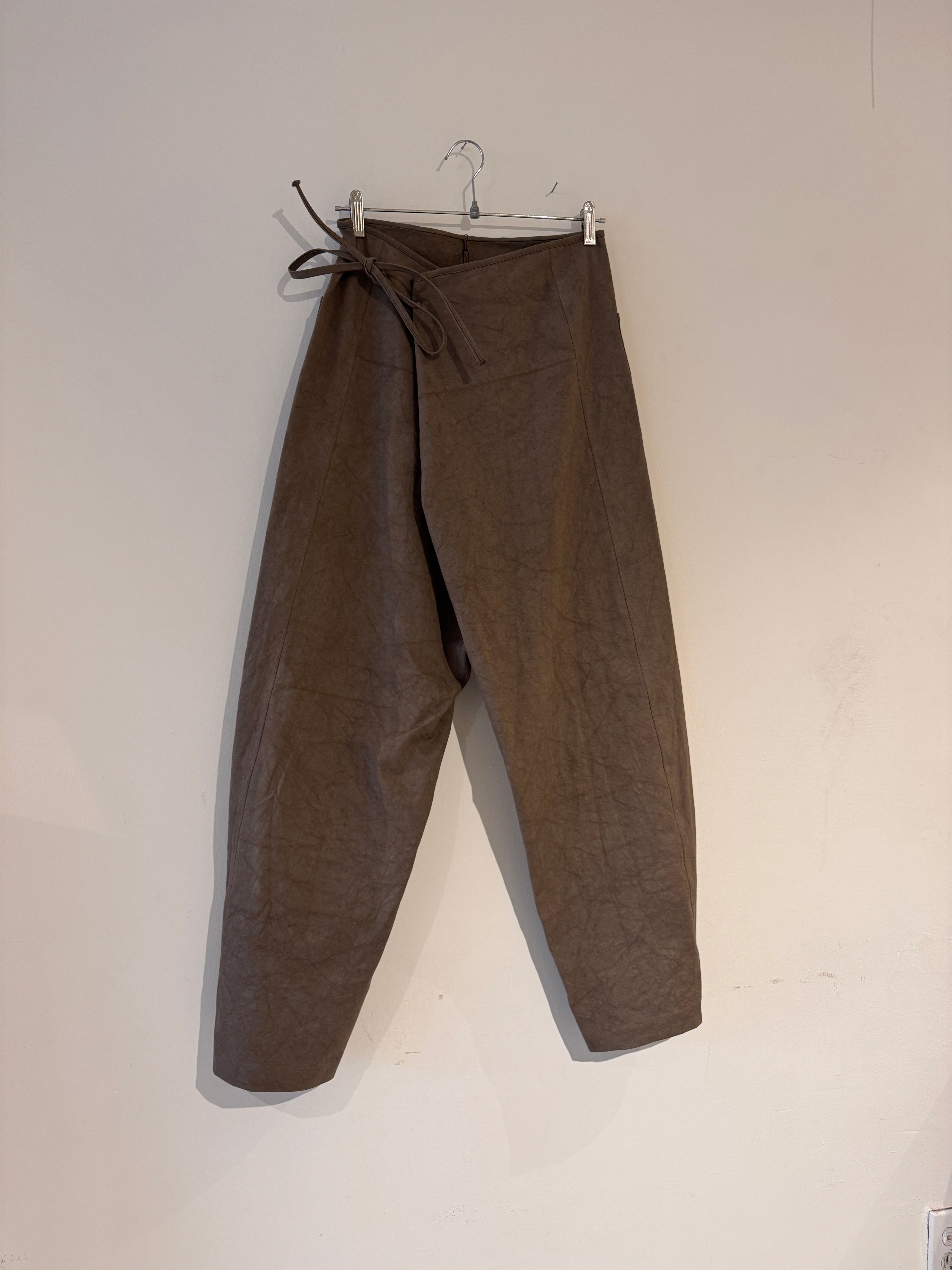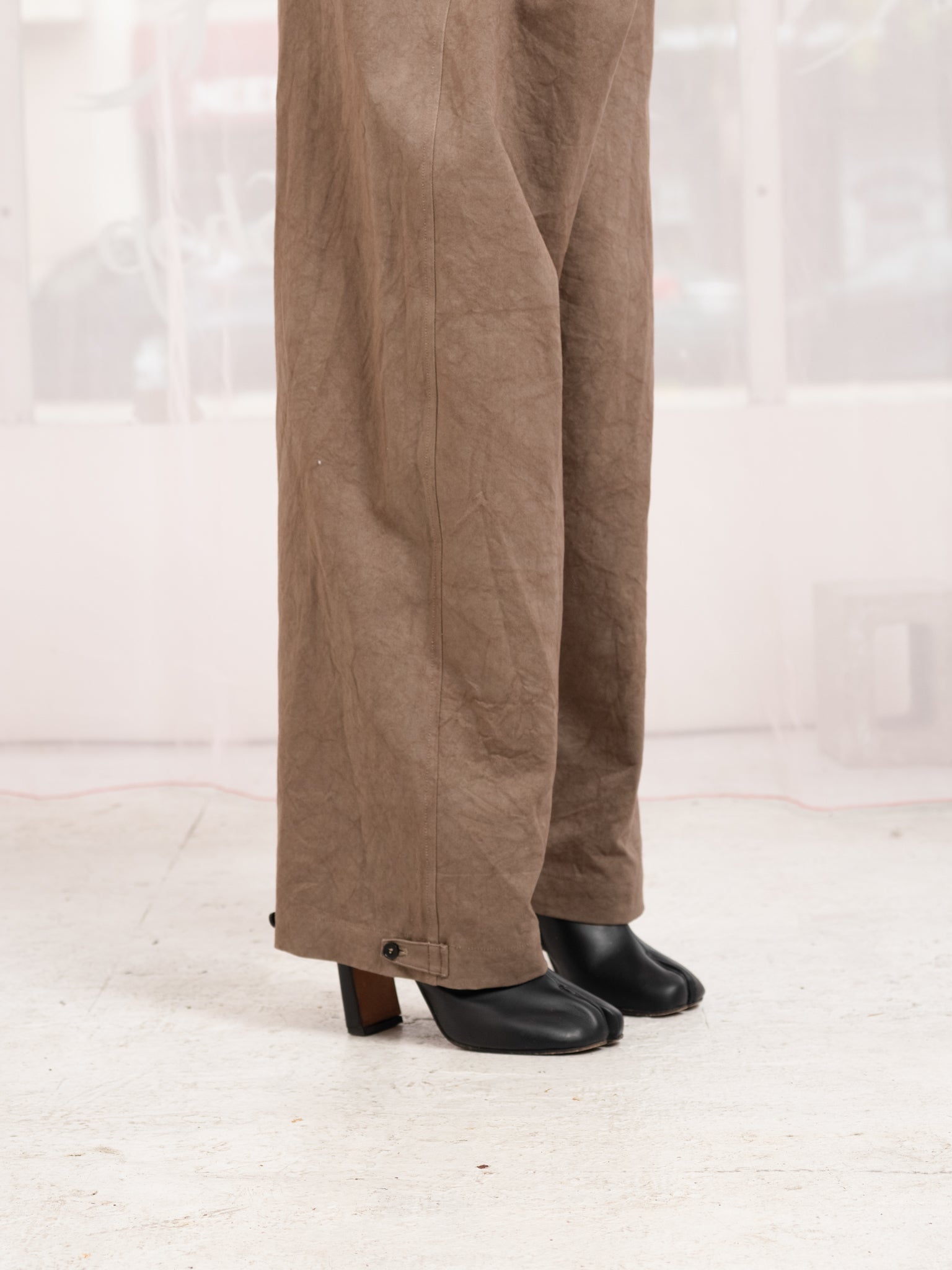 Wide leg brown pant with adjustable leg opening, creating a balloon effect or straight leg. Hand sewn button holes, a tailoring technique rarely done outside of traditional suiting ateliers. Two large pockets at back.