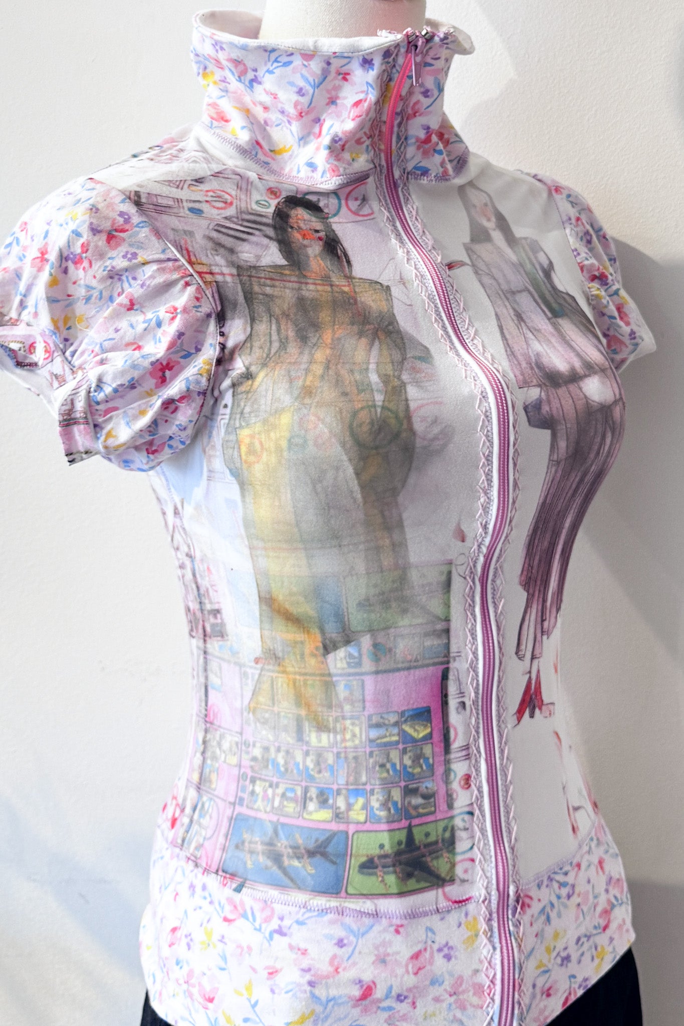 Cap sleeve zip up turtleneck with stenciling on sleeves and graphic illustrations. All pieces by Camila Frater are 1/1 handmade in New York. (Armsleeves not included)