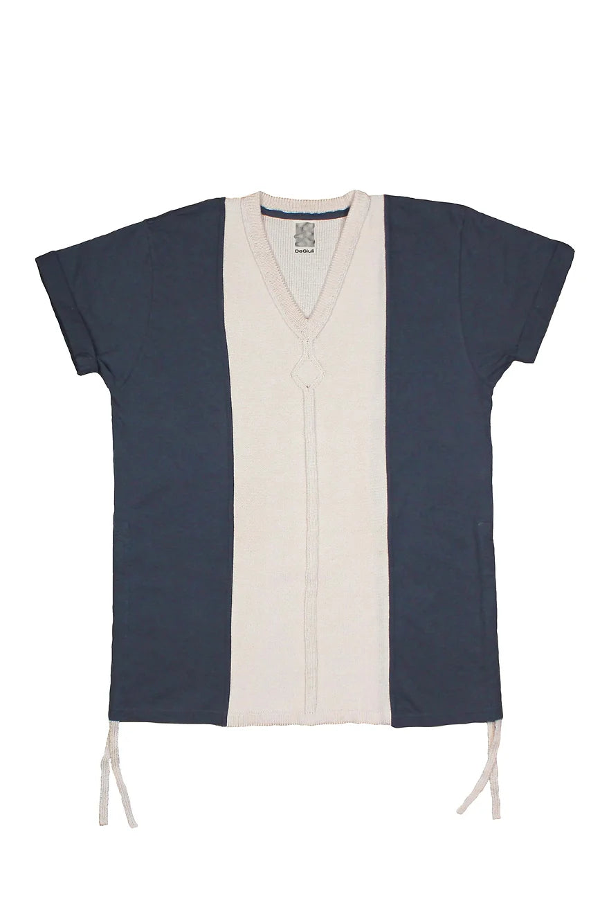 V-neck short sleeve t-shirt bodice with center knitted panel, featuring the collections signature aran diamond. Drawstrings placed along the sides allowing the shirt to be shirred and raise the hem at sides.