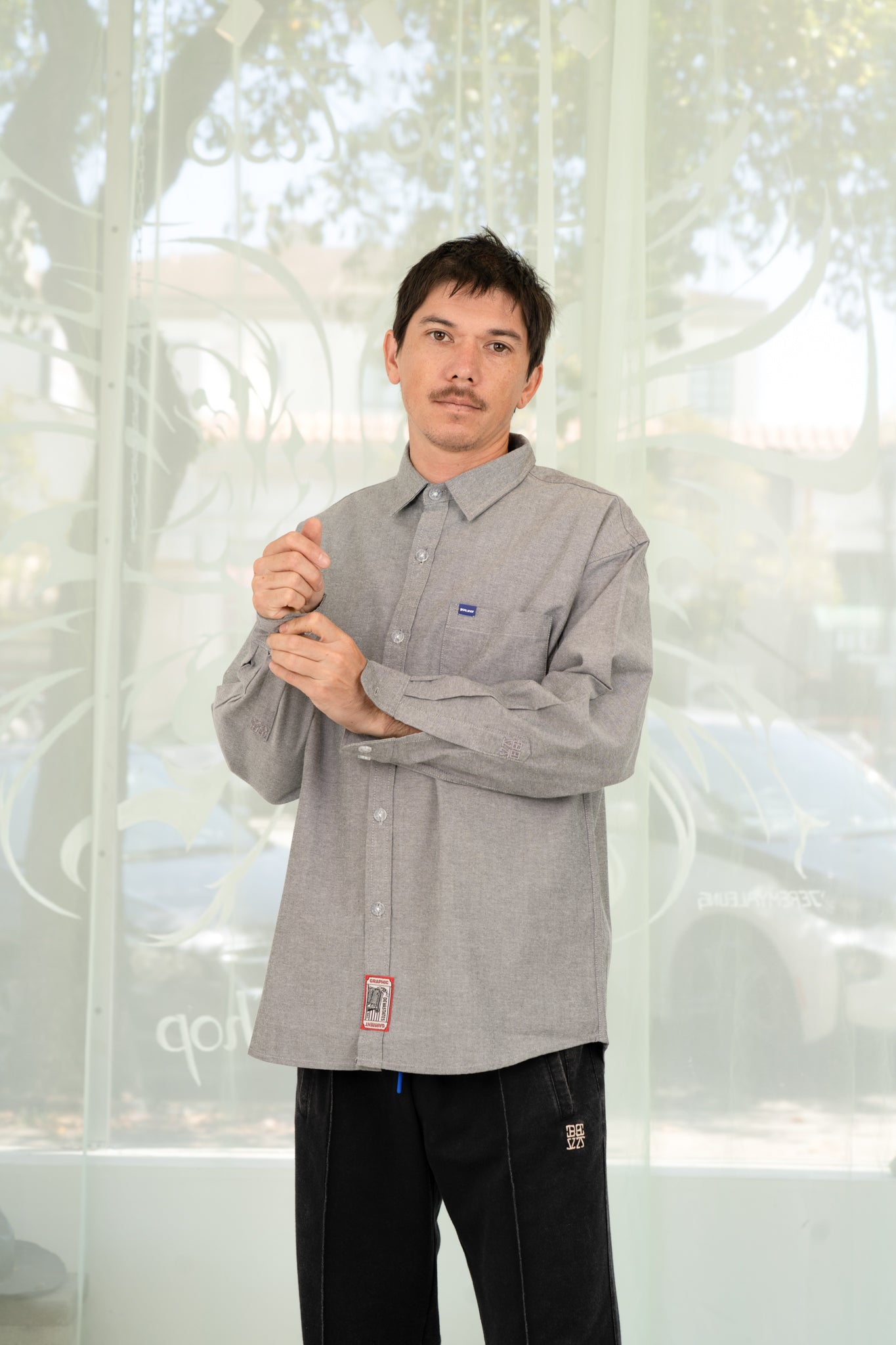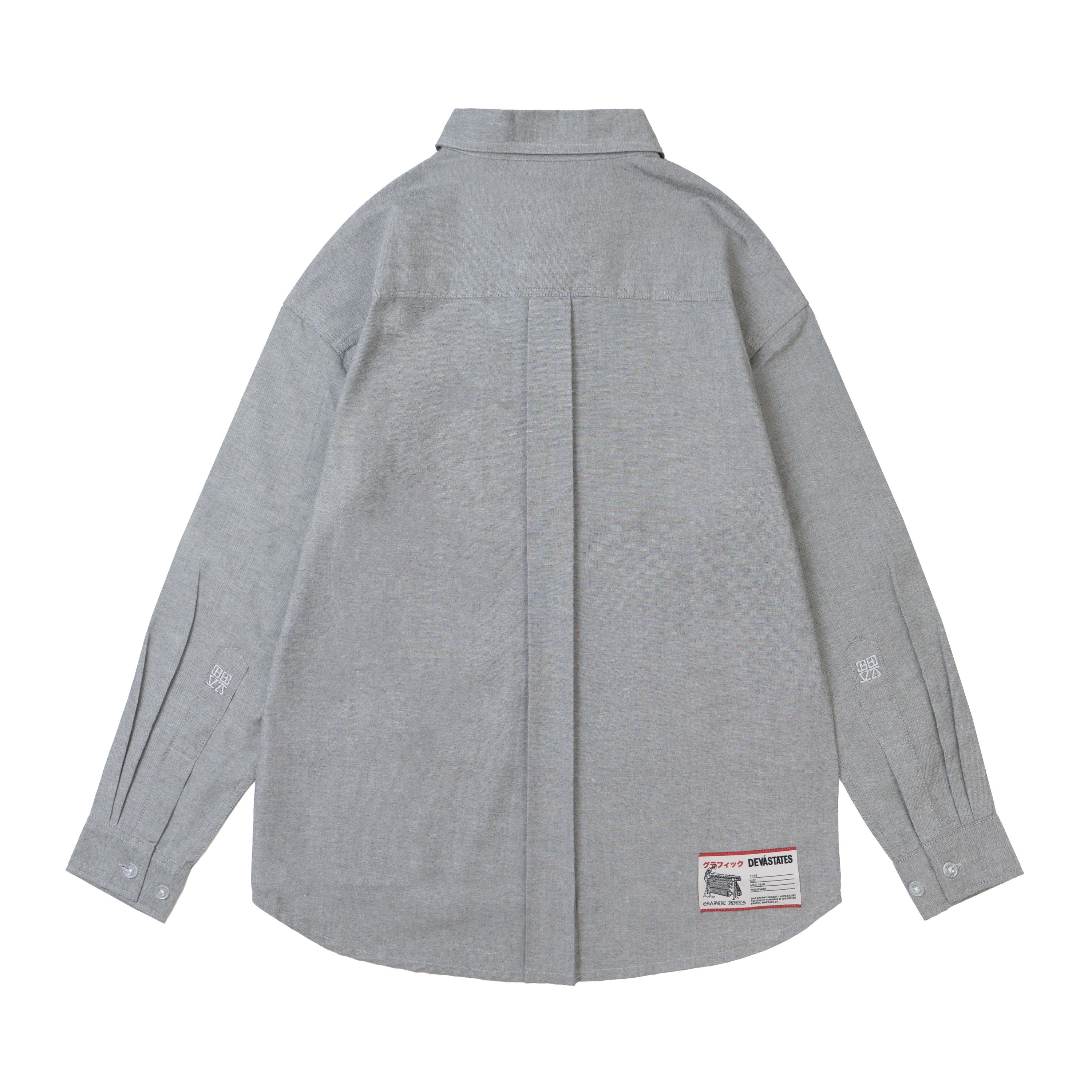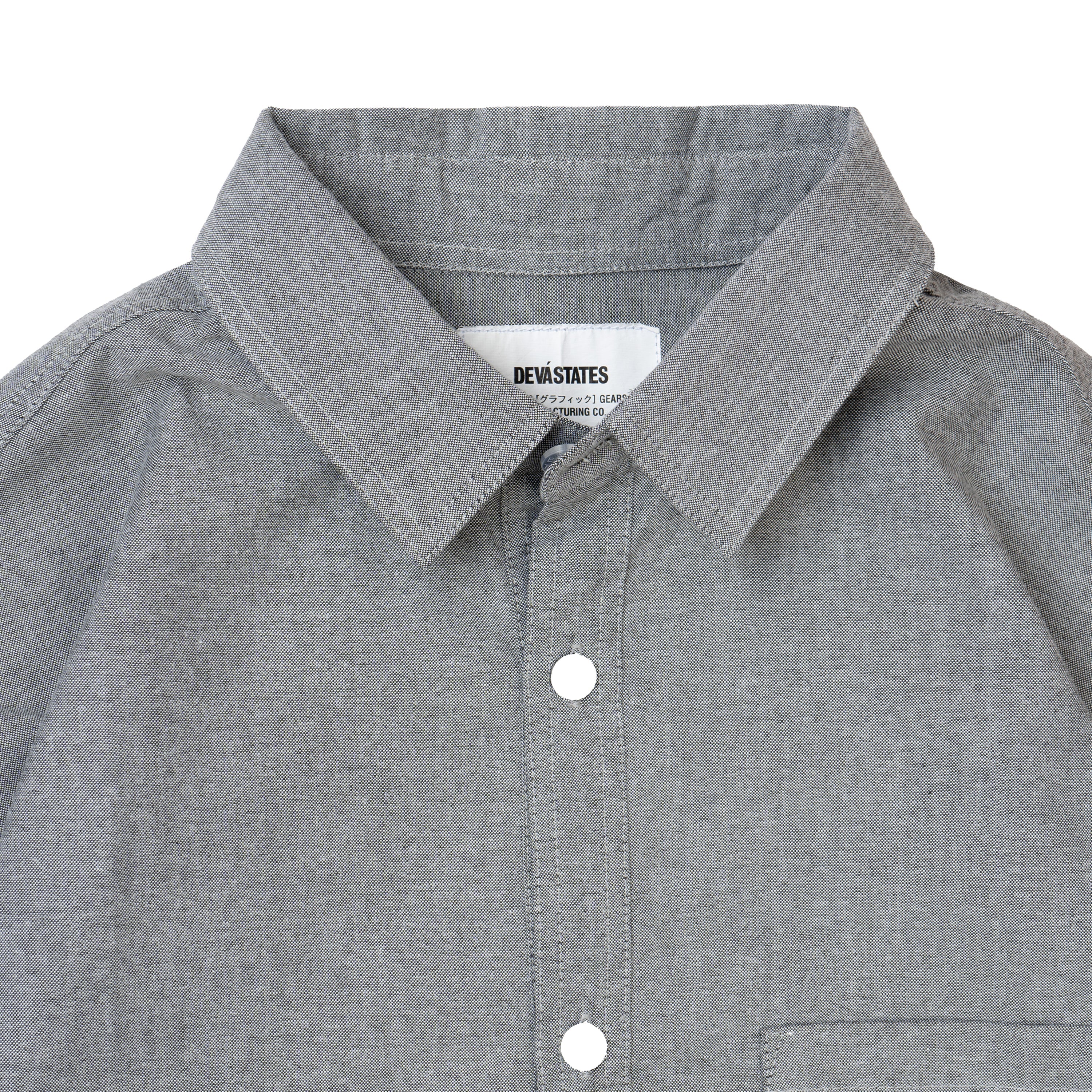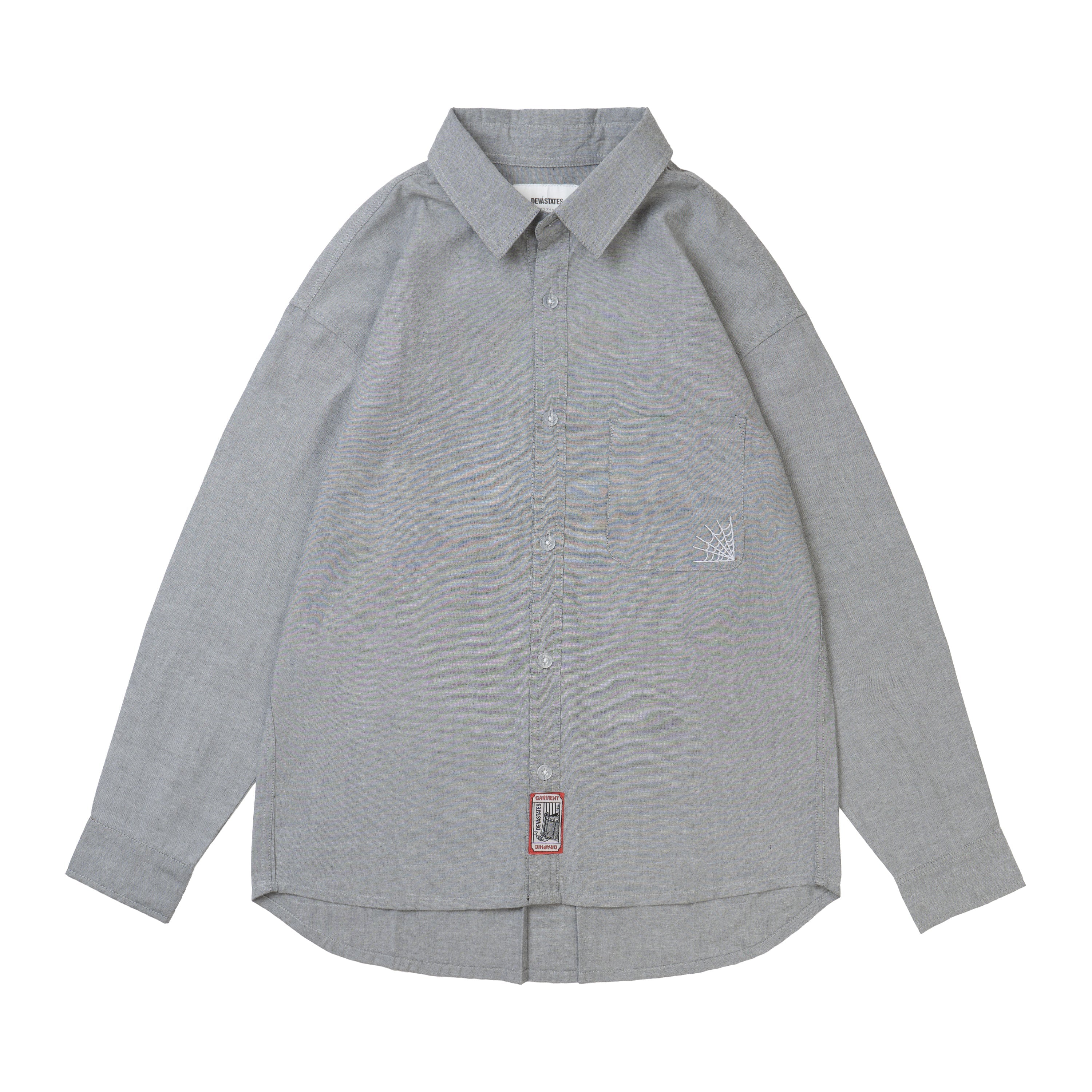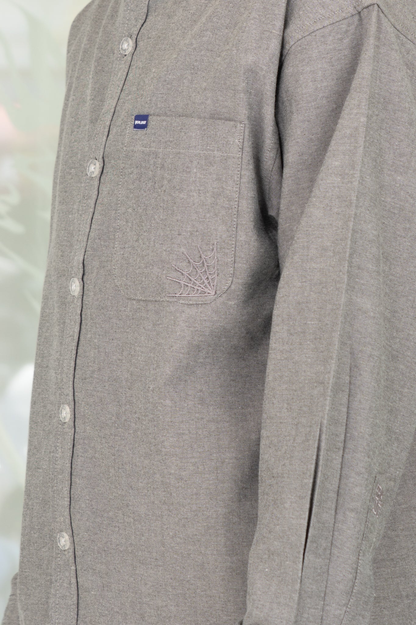 Gray cotton chambray collared shirt with embroidered spiderweb on left chest pocket.