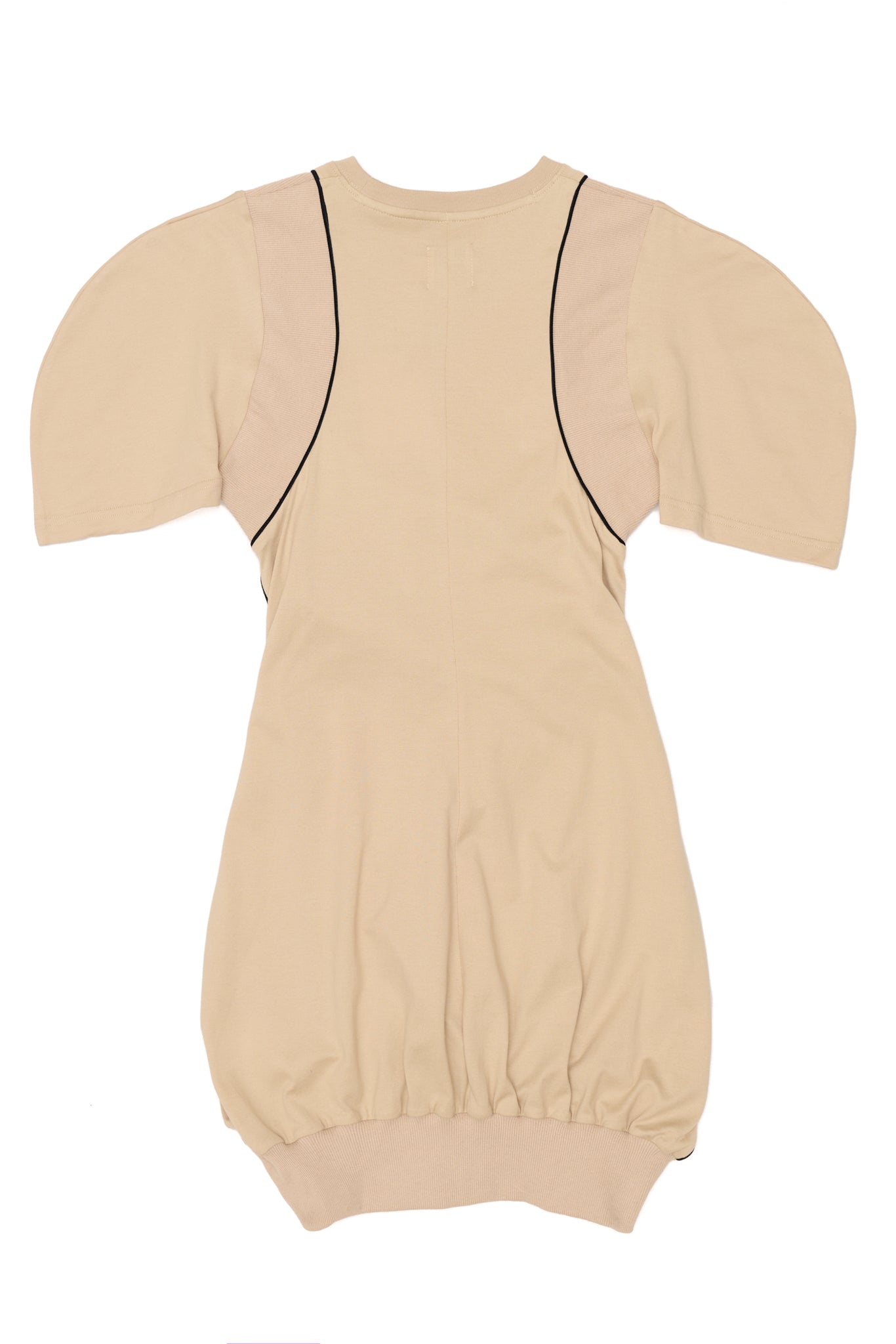 Short cotton jersey dress with wool rib banding which can also be styled as a t-shirt. Black piping detail and shoulder.