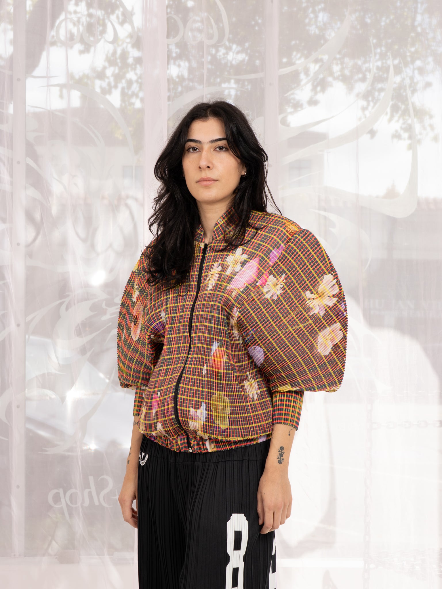 Pleated bomber jacket with voluminous long sleeves. Two front pockets. Fitted cuffs and elasticized waist. Zip closure.