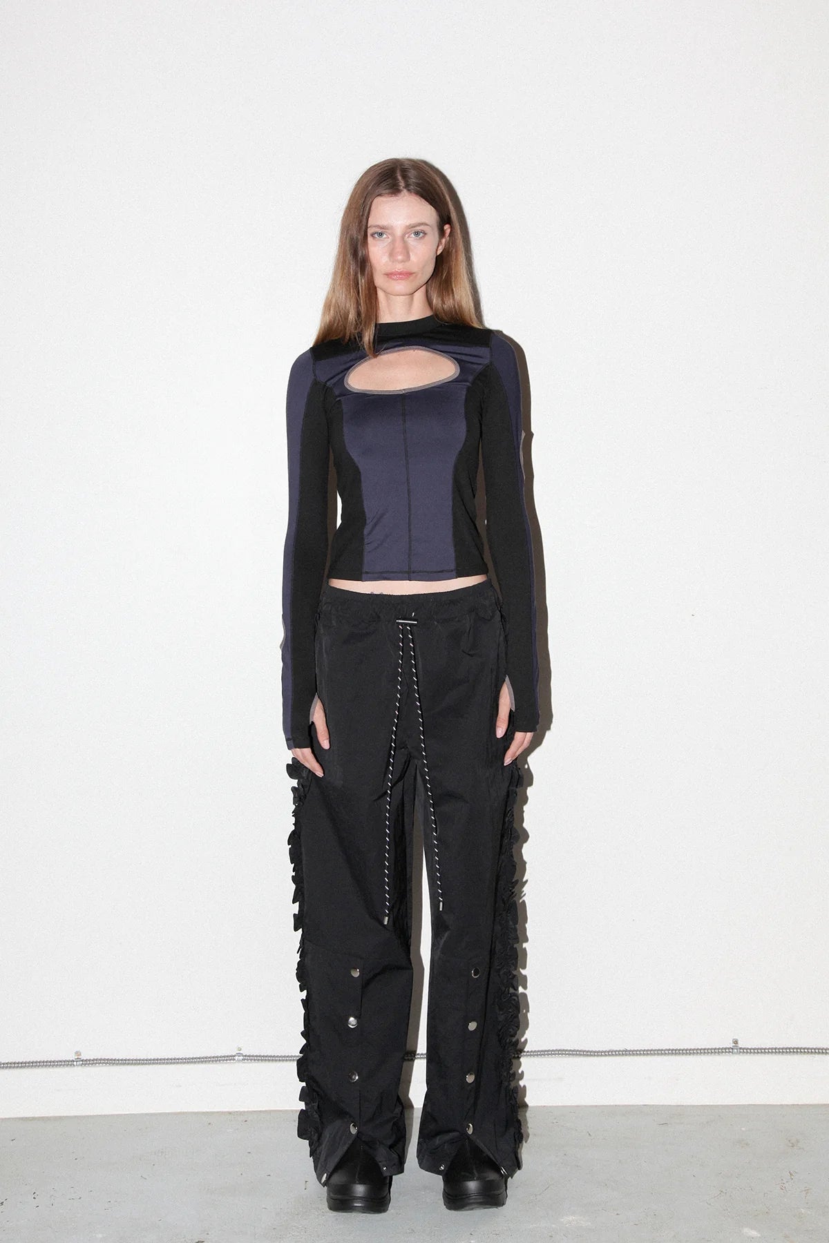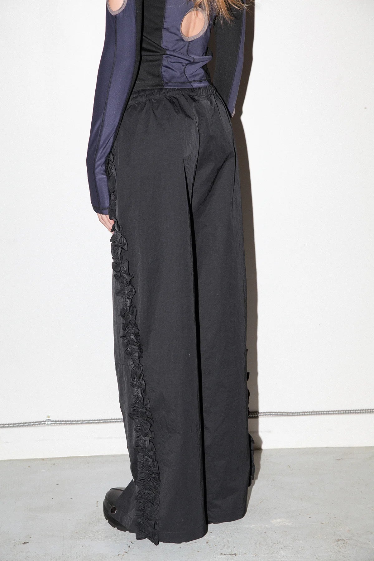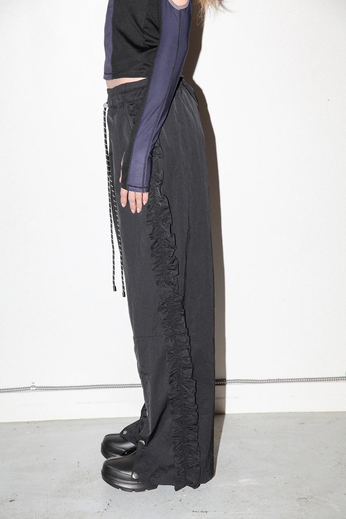 Crafted from recycled nylon with a water-repellent finish, these pants combine function with flair. Elastic waistband and reflective paracord drawstring, featuring ruffle detailing along the outseam and snap-front accents for a subtle utilitarian edge.