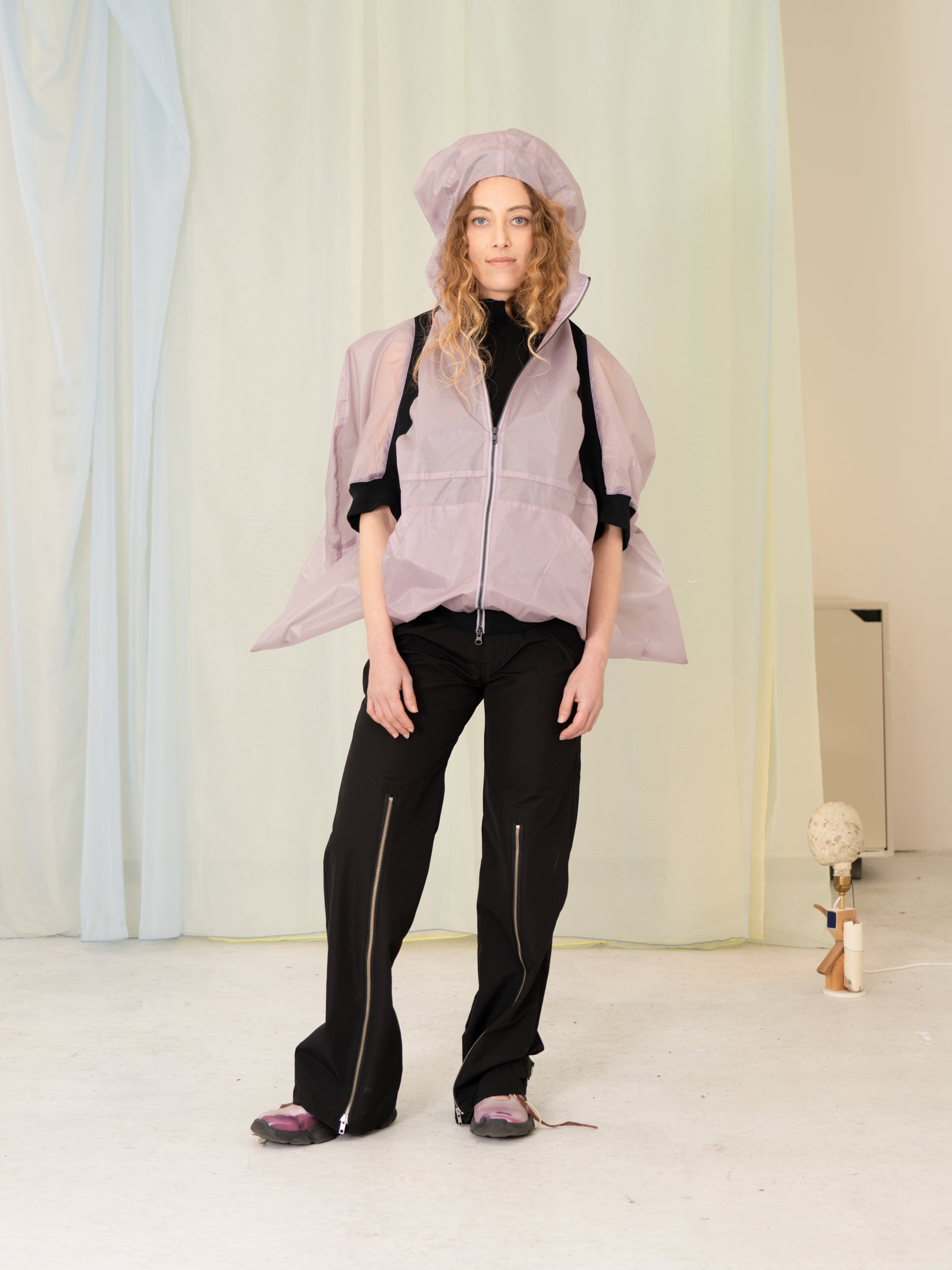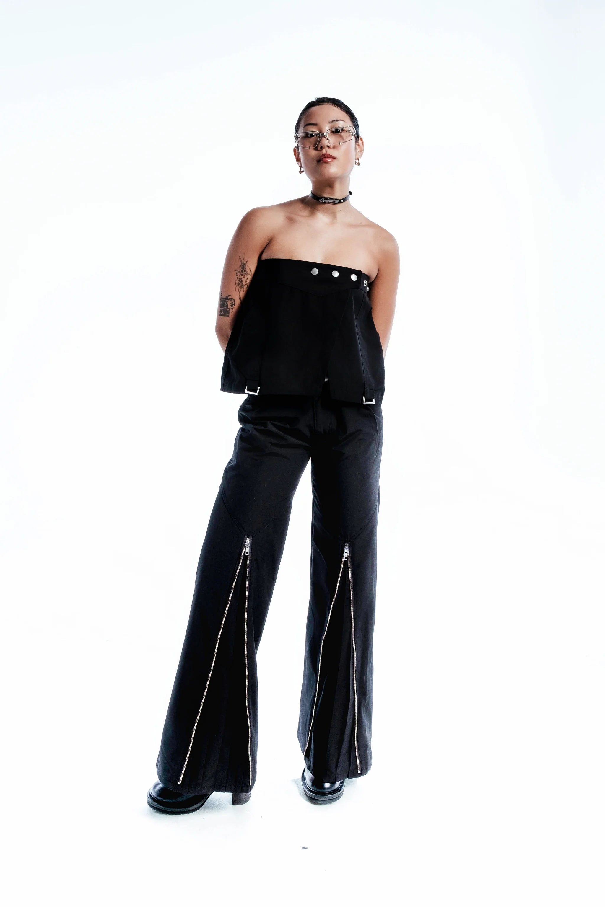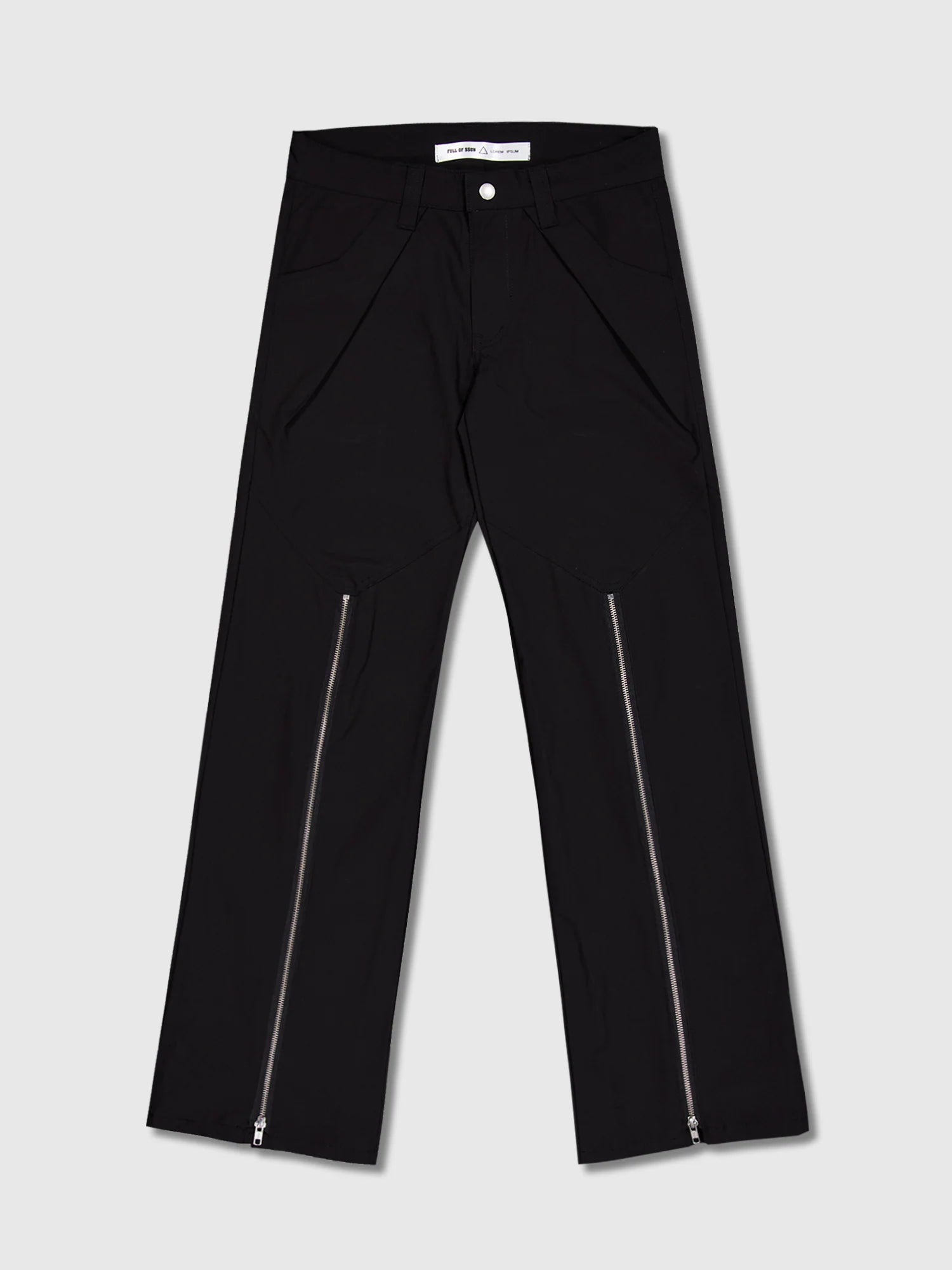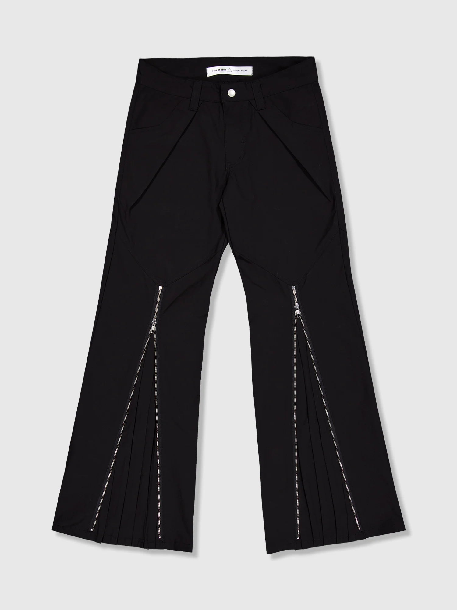 Straight cut nylon twill trousers with zippered legs that reveal pleated flares.