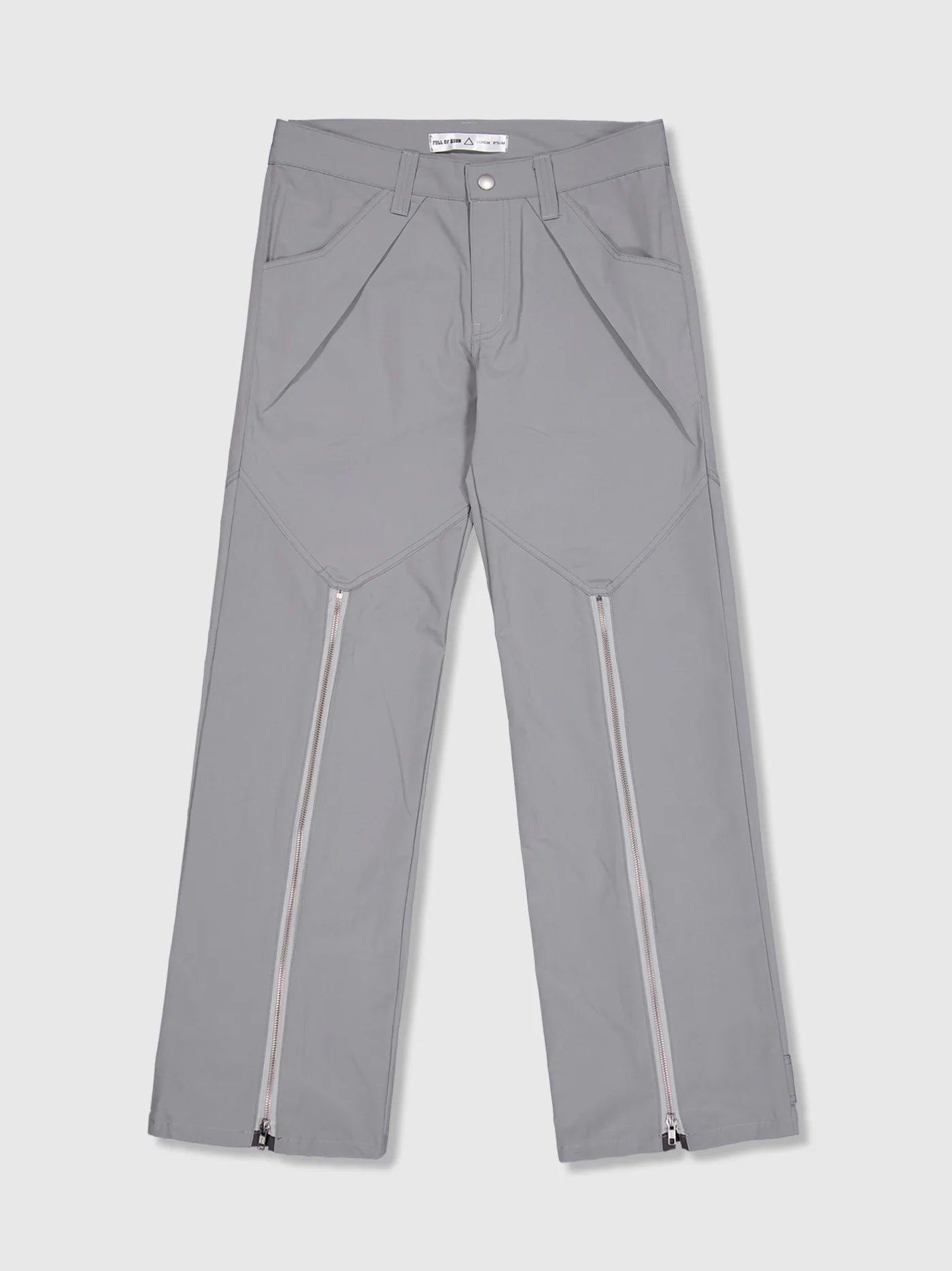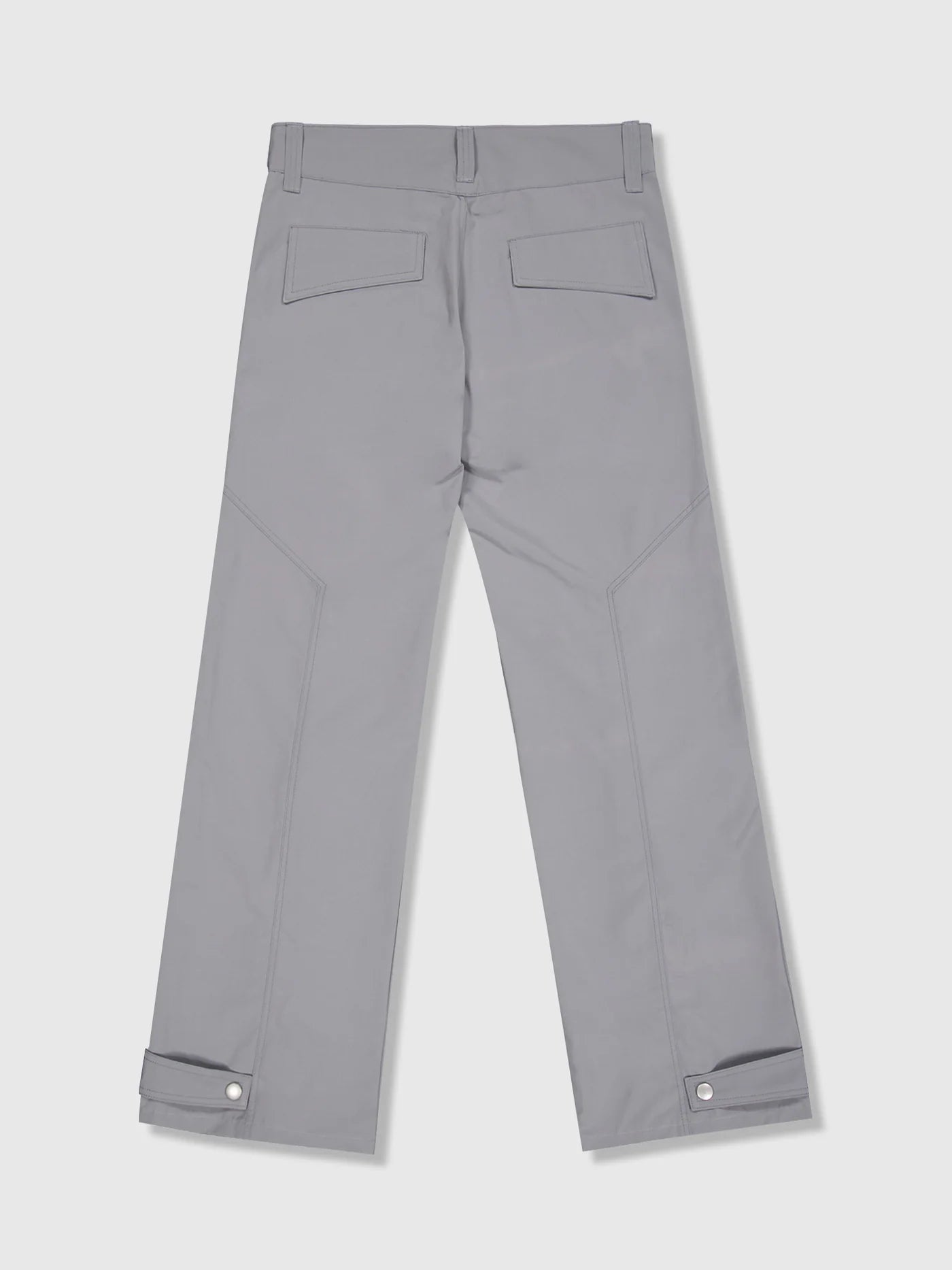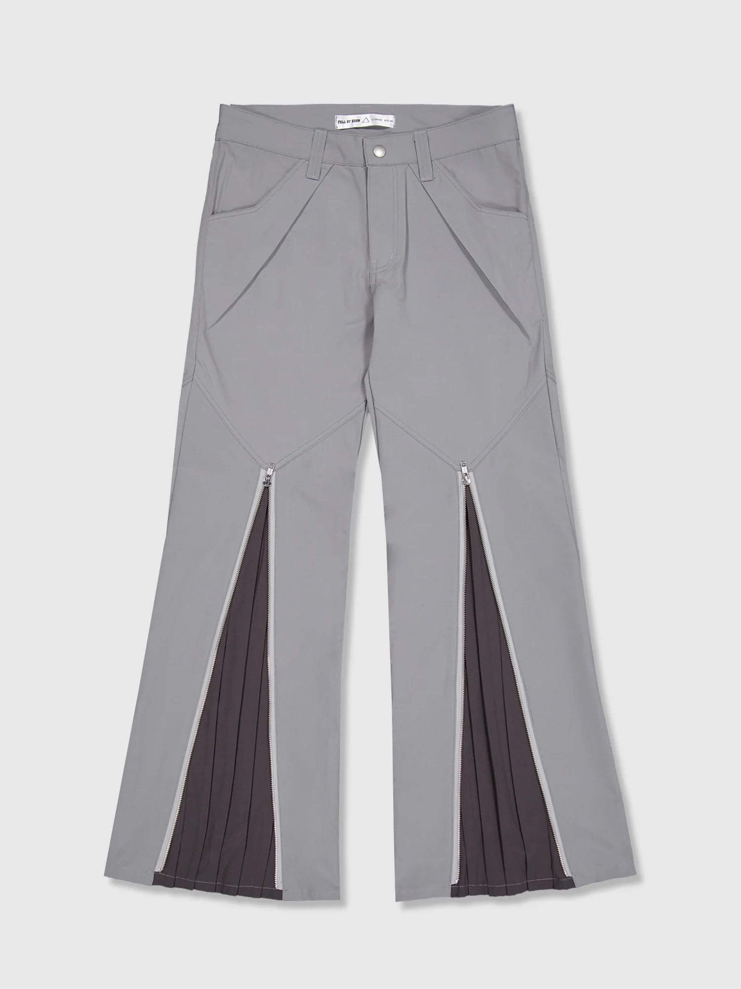 Straight cut nylon twill trousers with zippered legs that reveal pleated flares.