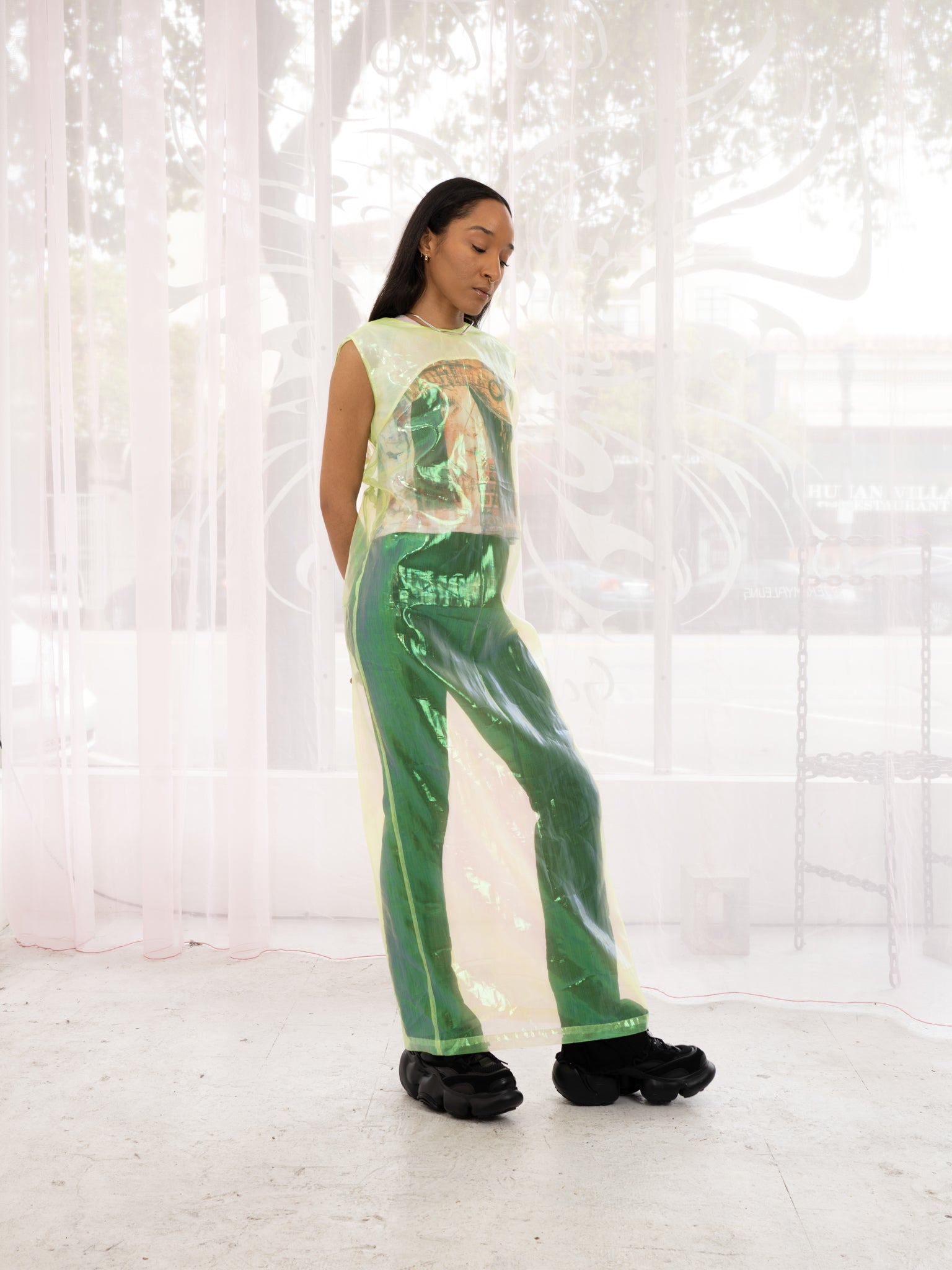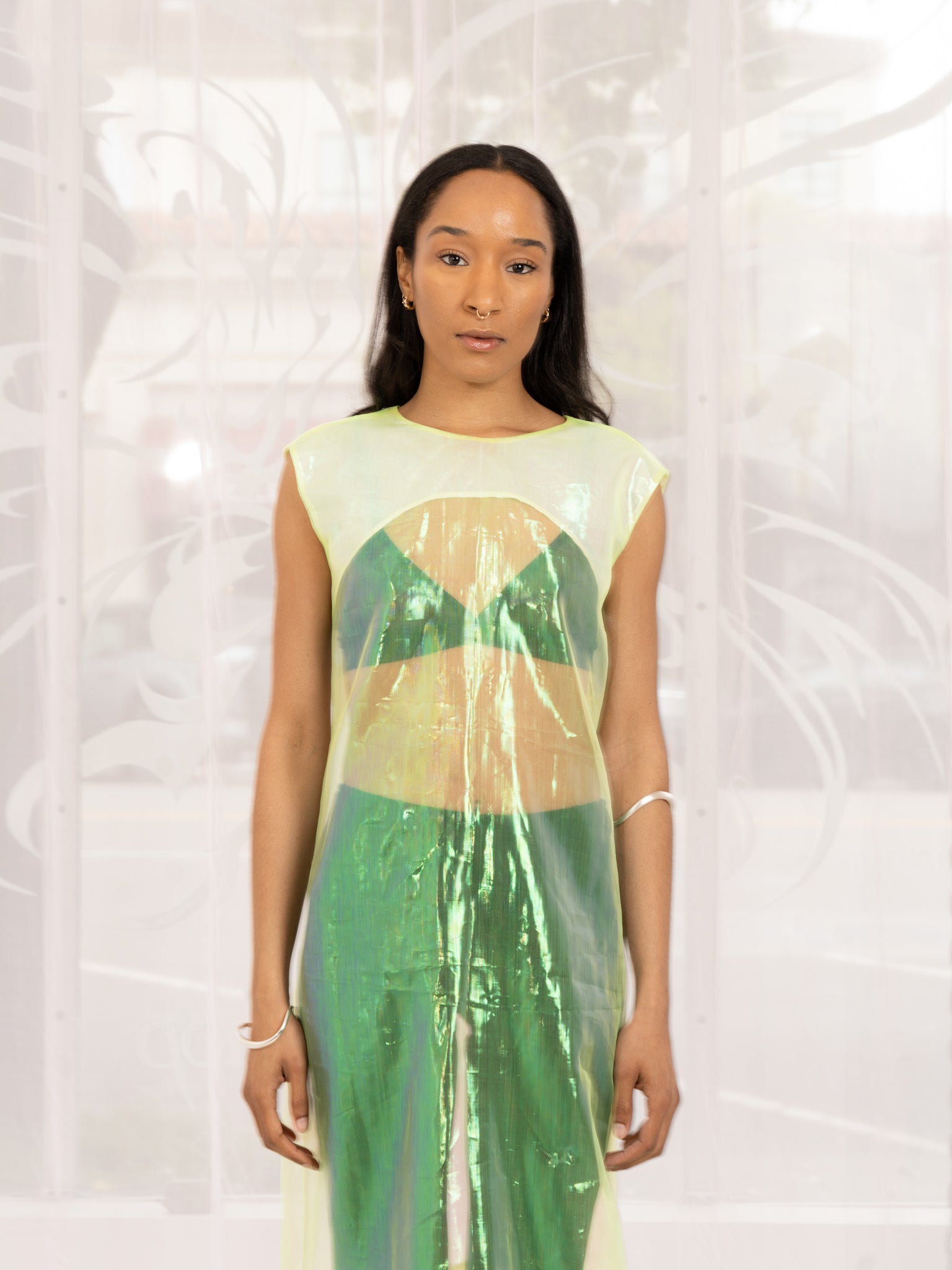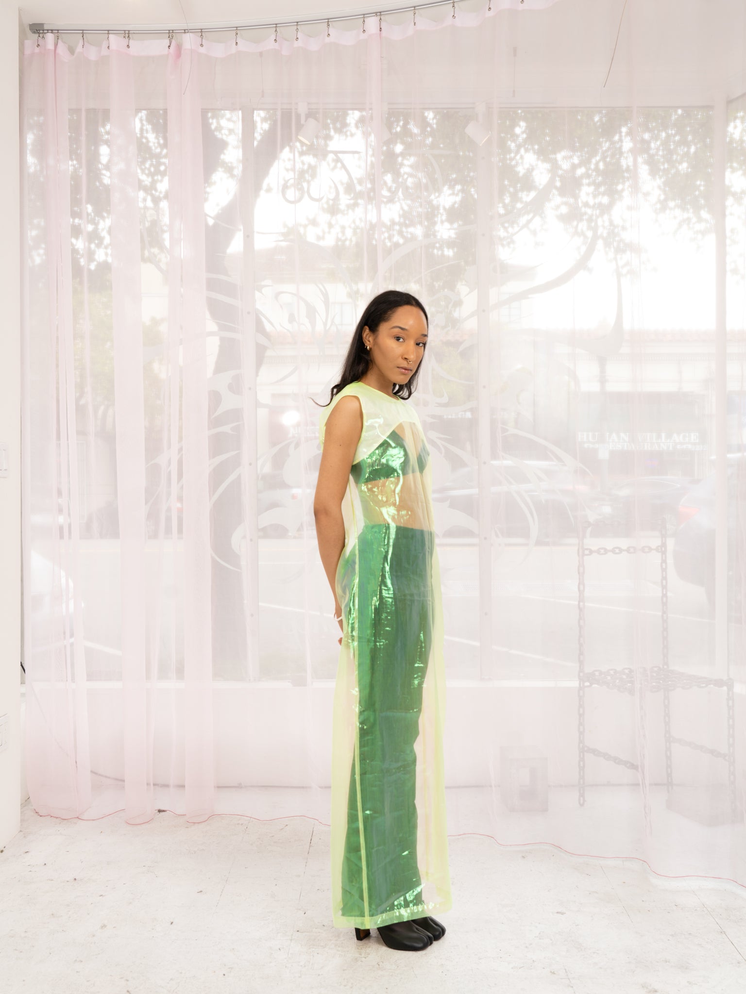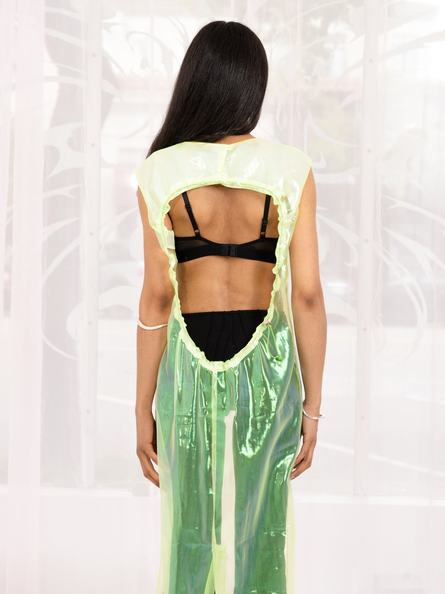 Sheer sleeveless yellow/green iridescent long straight dress with circular and adjustable back cutout. Drawcord cinch allows for sizing to be adjustable. Back slit.