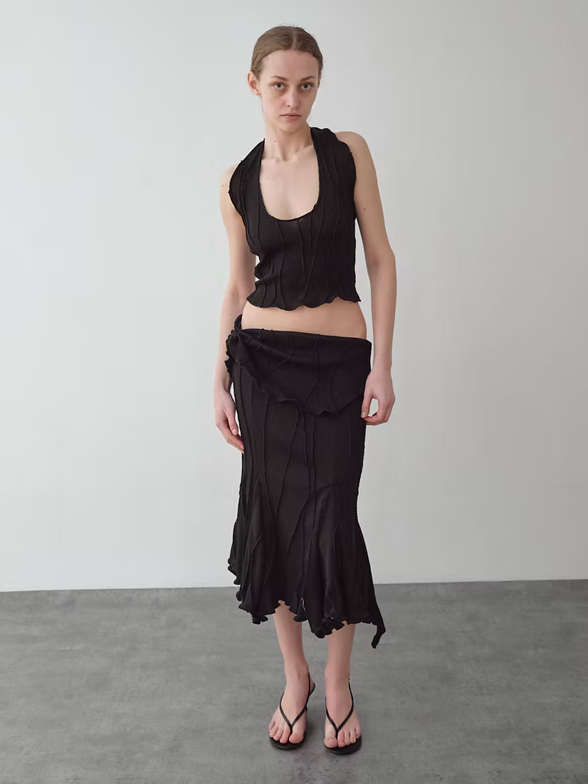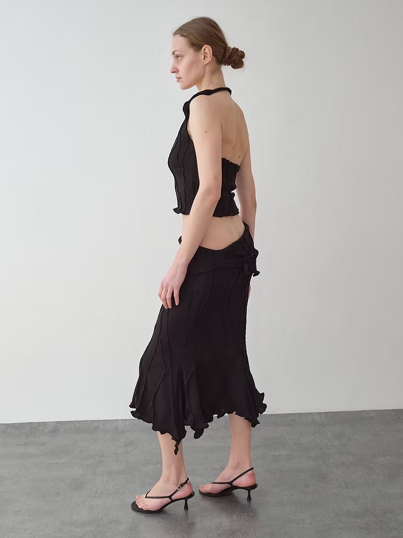 Ribbed knit low-cut halter top. Unique handmade suture formation on each item.