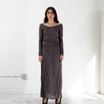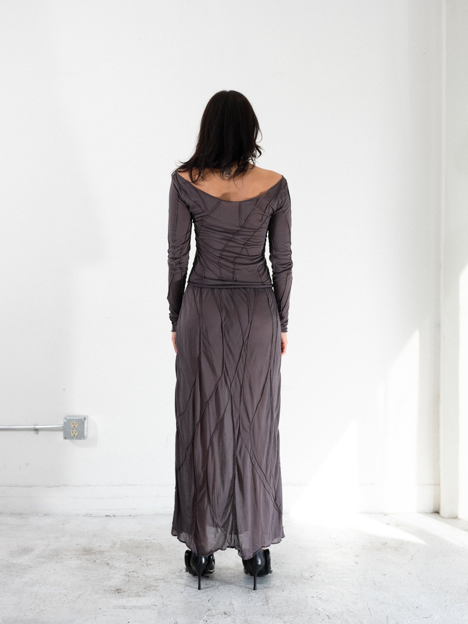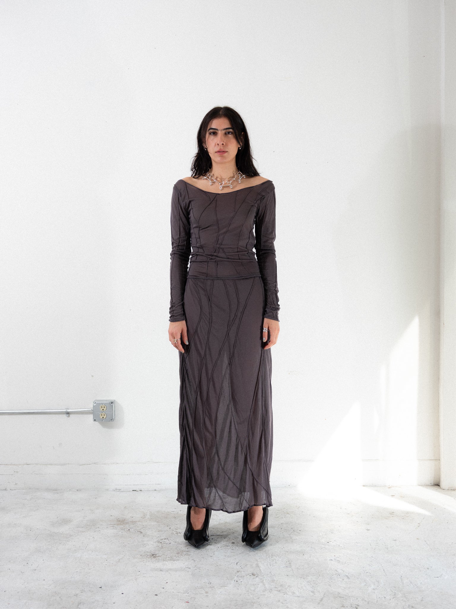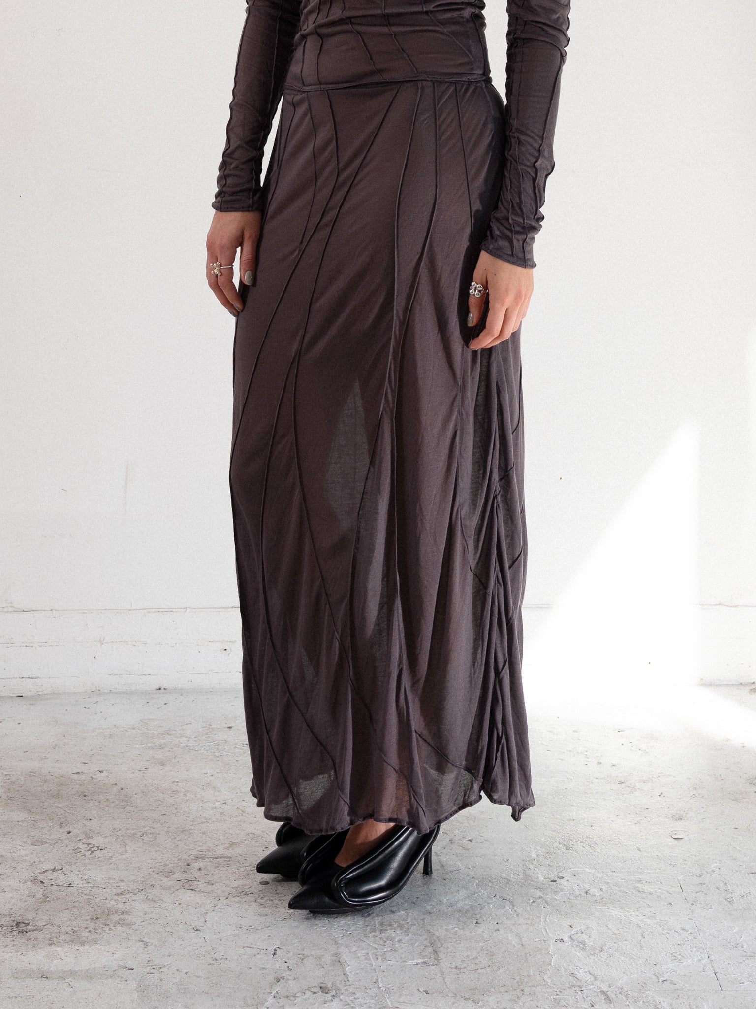 Slightly sheer flared low waist midi skirt. Unique handmade suture formation on each item. Finished garments may vary due to artisanal manufacturing. Designed and sewn in Poland.