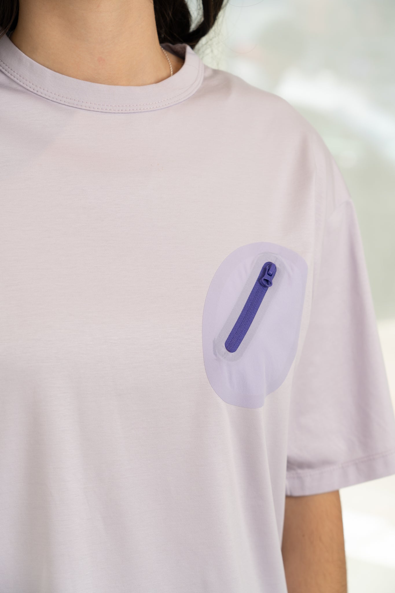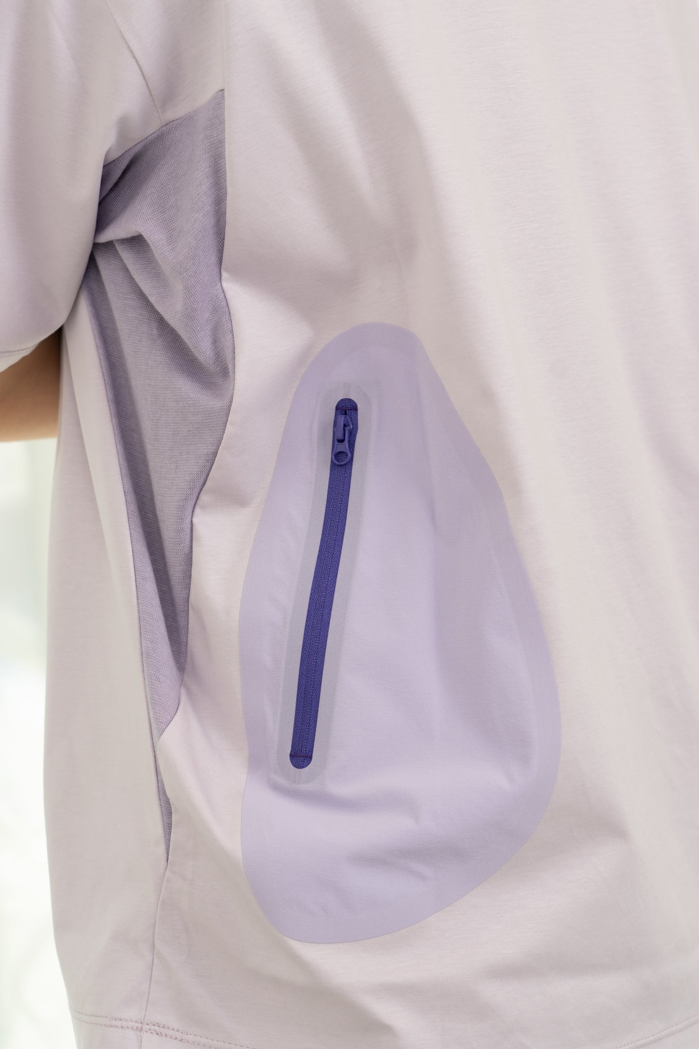 Short sleeve round neck tee in purple with oval chest pocket and mini zip. Knit stretch contrast side panels—infusing technical function with street style.