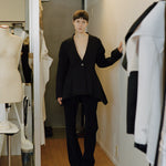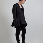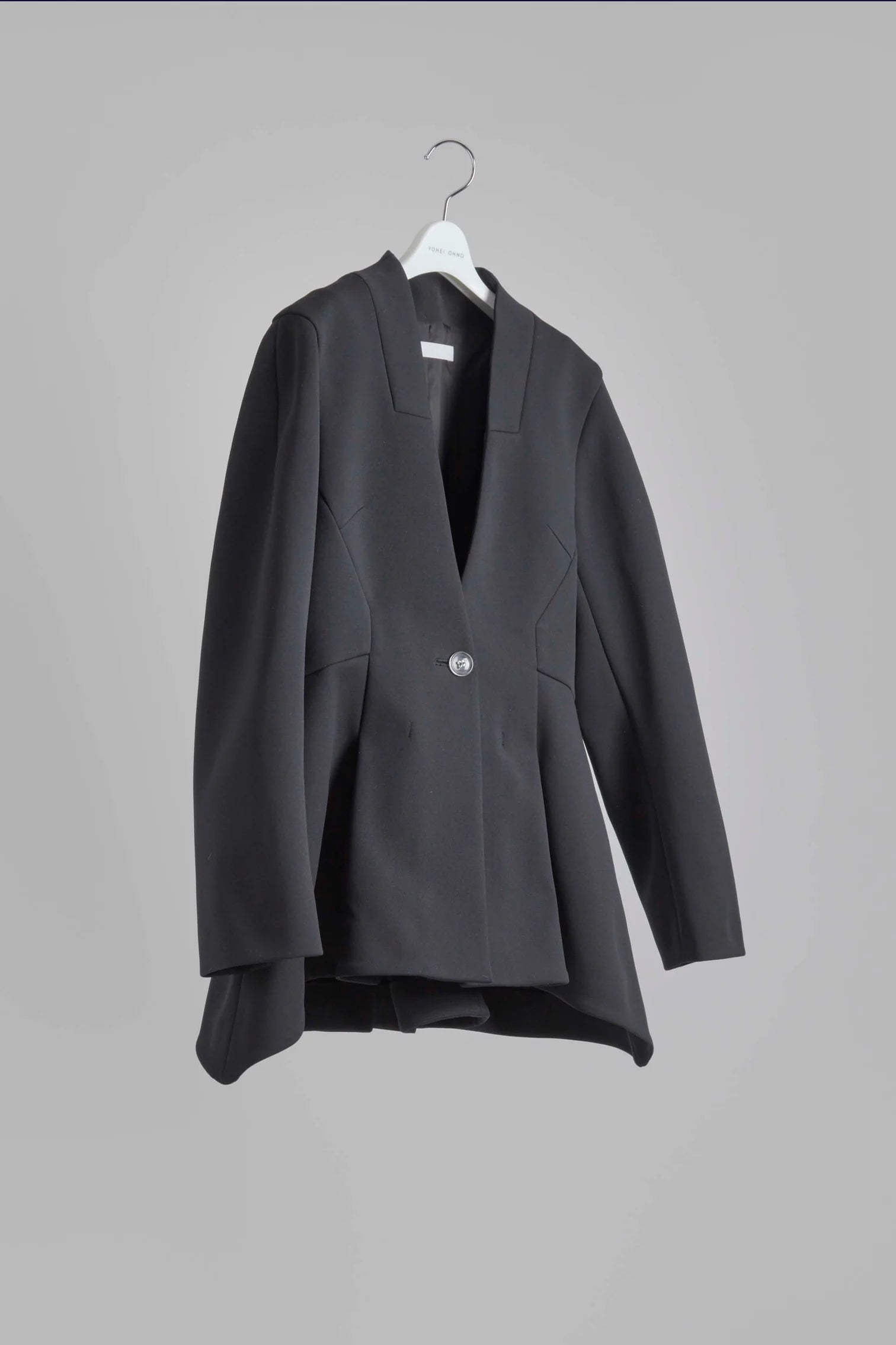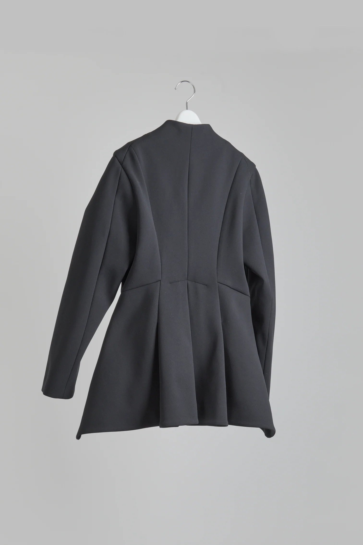 This is an oversized version of the women's jacket presented as the uniform for the “Sumitomo Pavilion” at Expo Kansai, Osaka. It features large pleat like wings. The sculptural shape is achieved with a scuba material that is firm and taut.