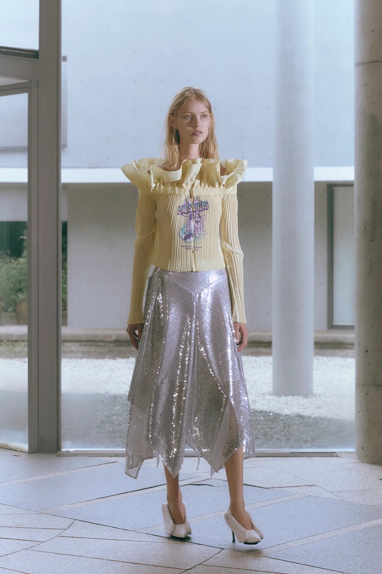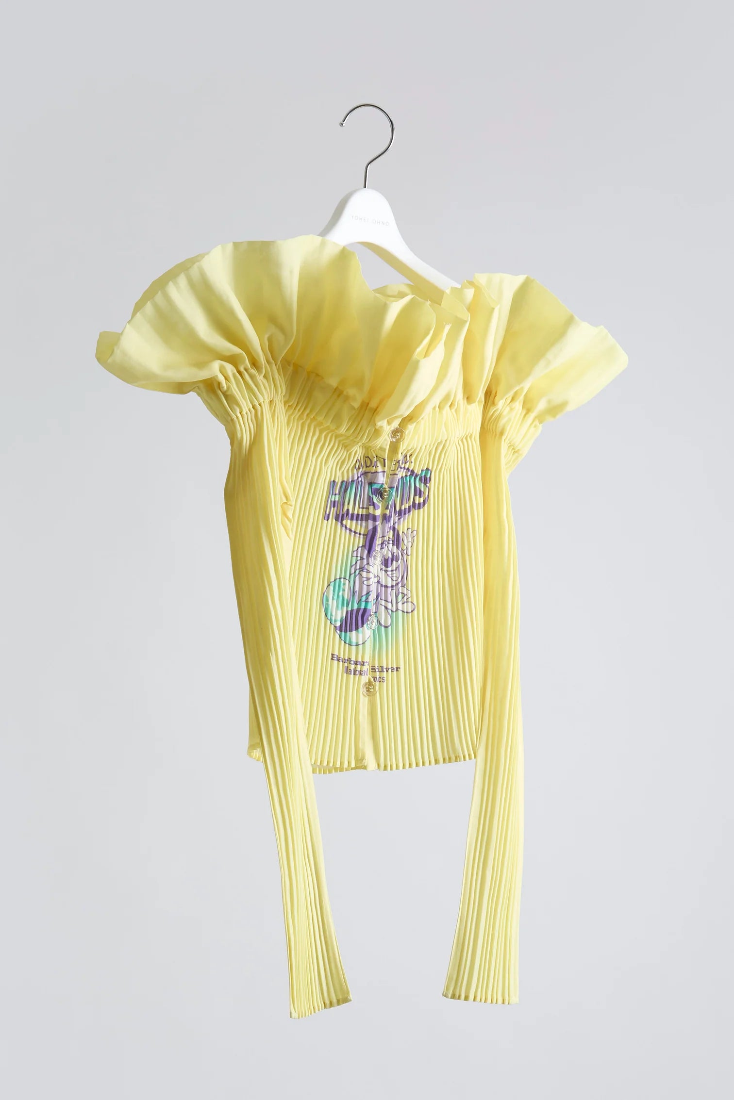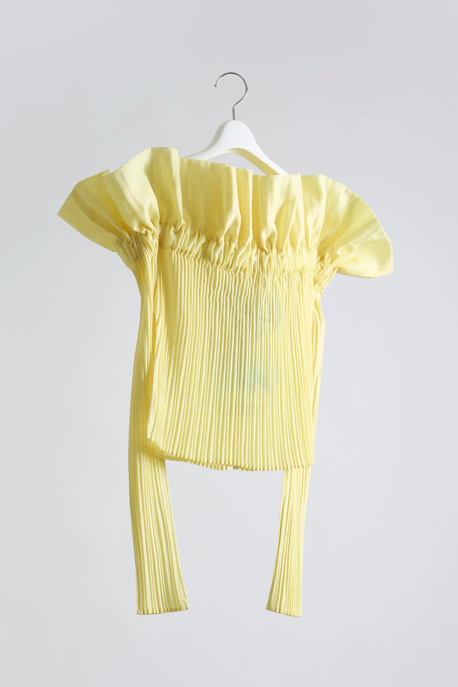 Bright yellow off-shoulder pleated blouse. The raised fabric around the bust adds a distinctive design touch. Features digital print detailing at the chest. Feminine yet artistic, with structured form and vibrant color.