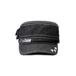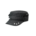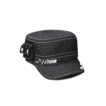 Structured denim cap reminiscent of painter’s hats, with a flat crown and short brim.