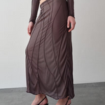 Slightly sheer flared low waist midi skirt. Unique handmade suture formation on each item. Finished garments may vary due to artisanal manufacturing. Designed and sewn in Poland.