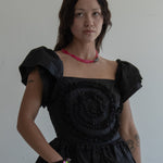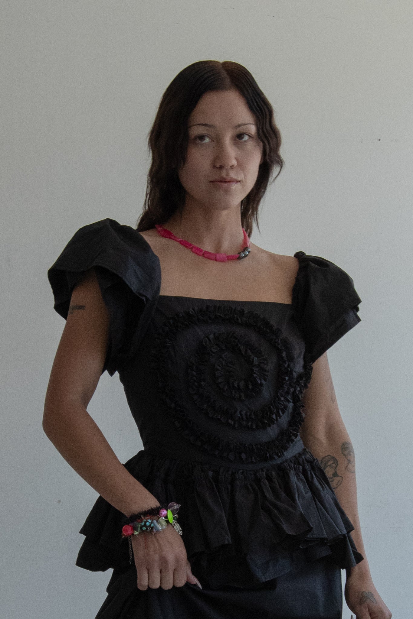 Mathilde Hiron is a French designer who transforms luxury deadstock and vintage materials into sculptural, one-of-a-kind fashion and accessories. Her work blends craftsmanship and sustainability to create richly textured pieces.