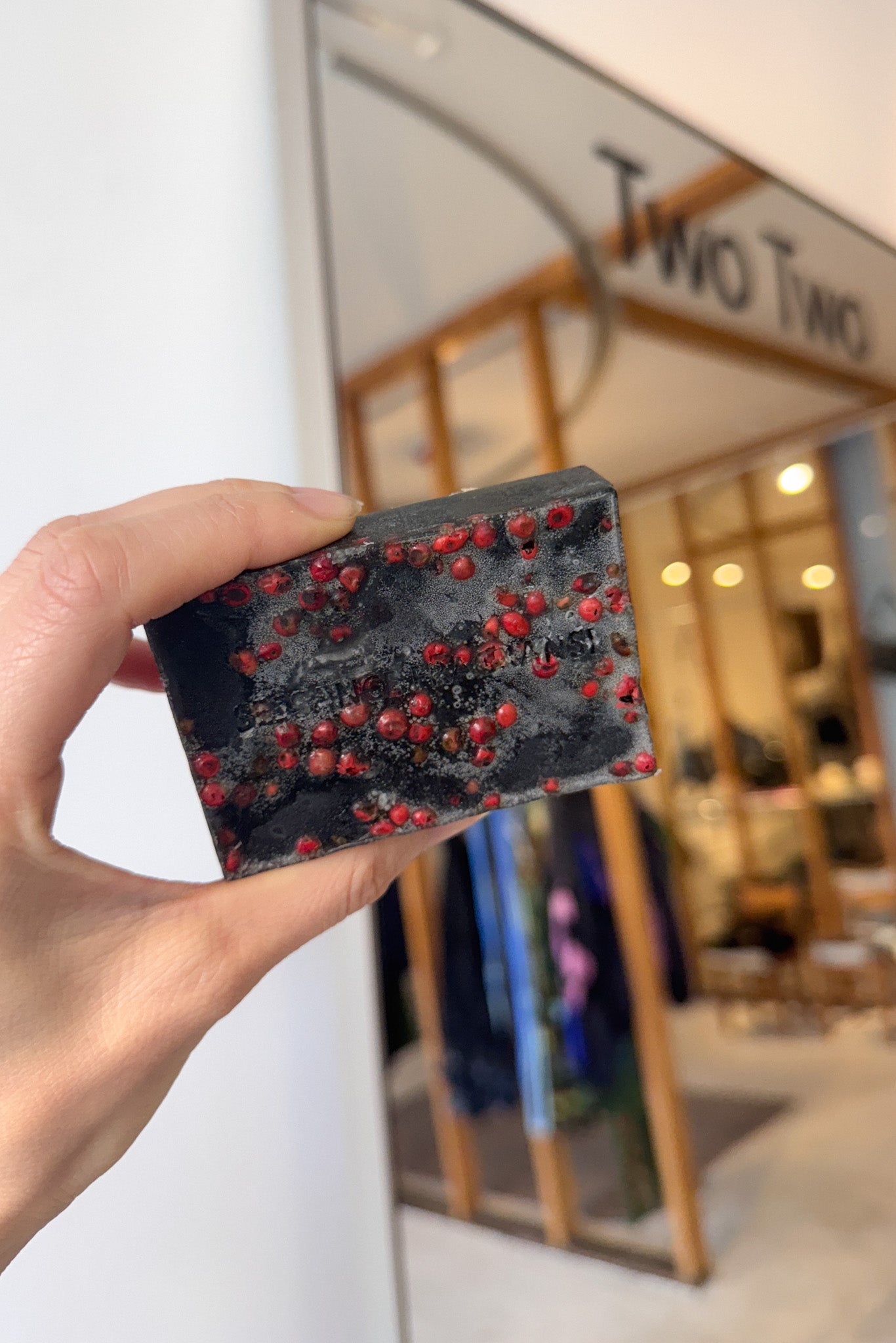 Claim your sudsy block! Pink peppercorns for a bit of exfoliating grit, hinoki oil and clove for a grounded feeling
