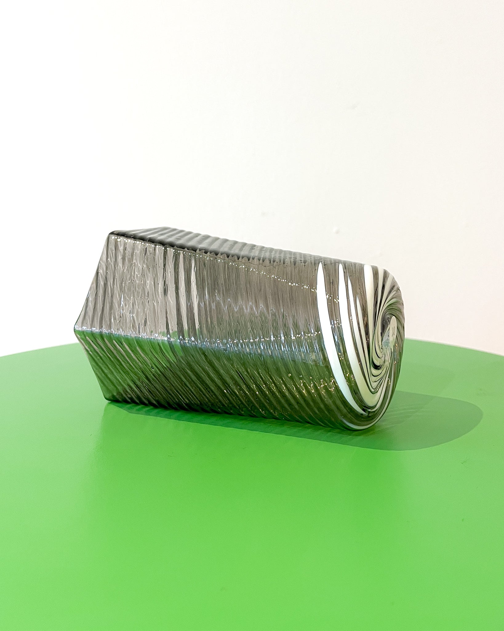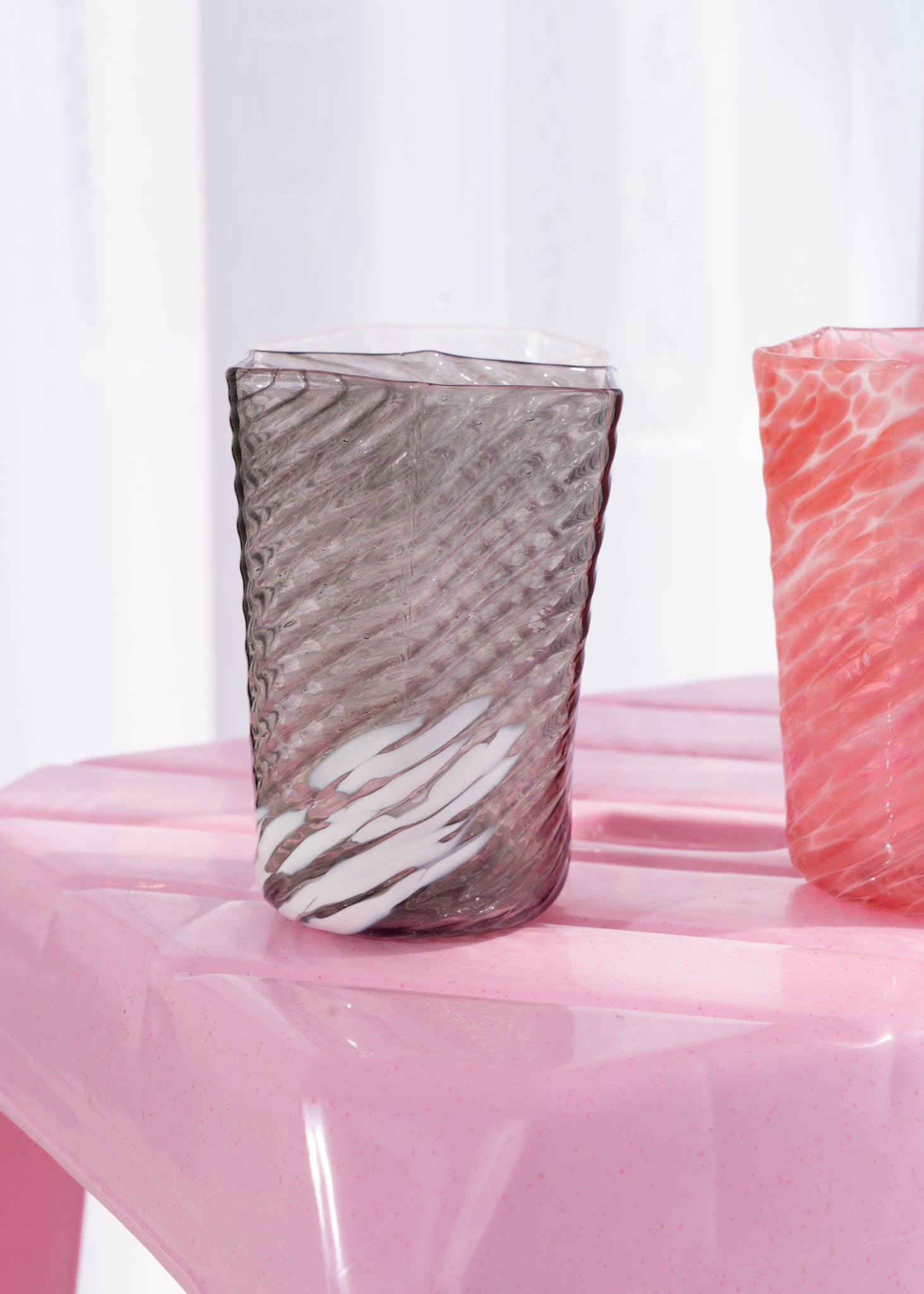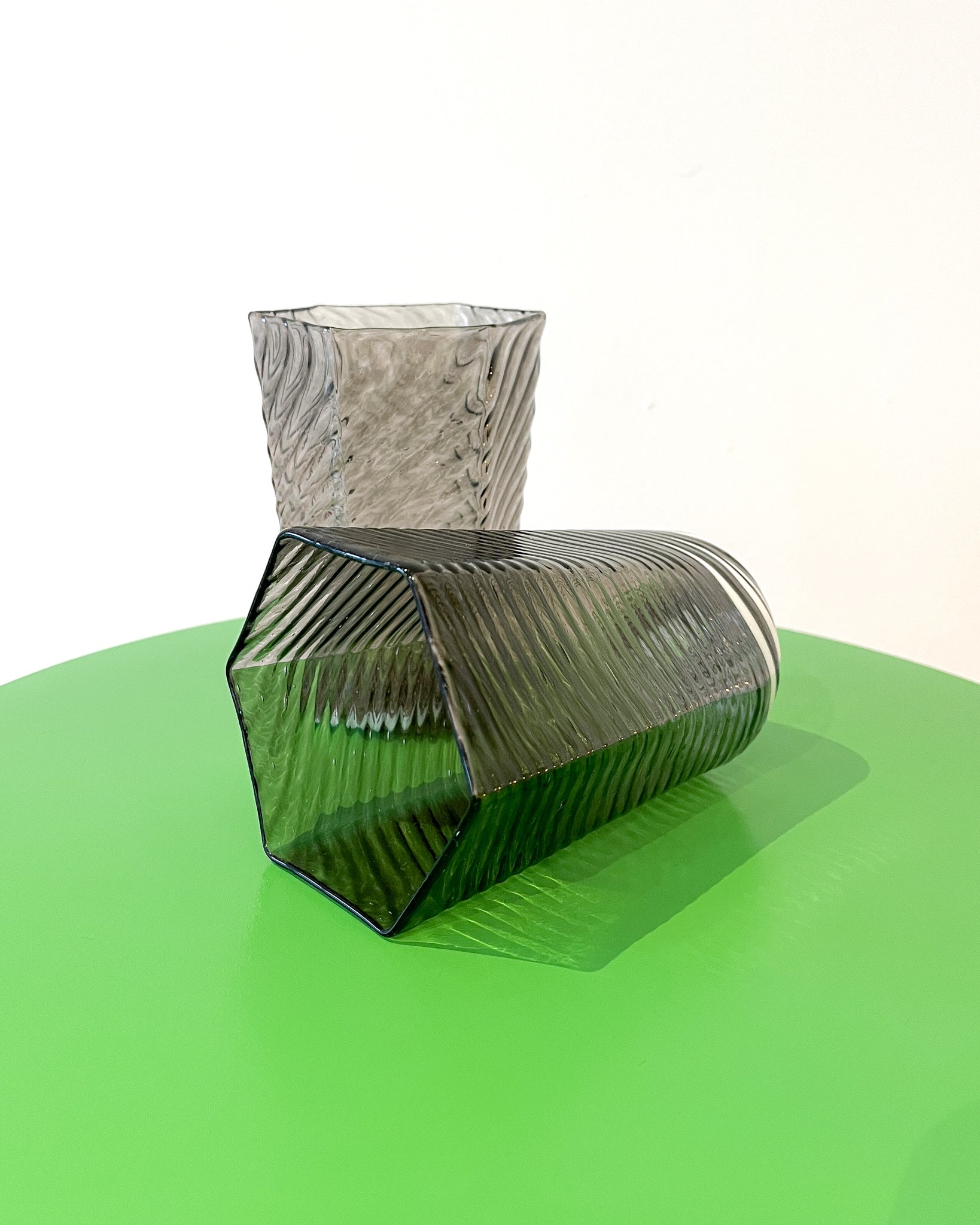 Hand blown organic hexagon shaped cups with a swirly pattern made on his mobile furnace by glassblower Arthur Wilson in Mableton, Georgia.