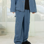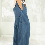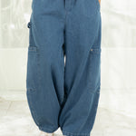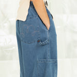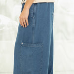 Wide leg pants in medium wash denim with 5 big pockets. Elastic waist + drawstring. Made in LA.