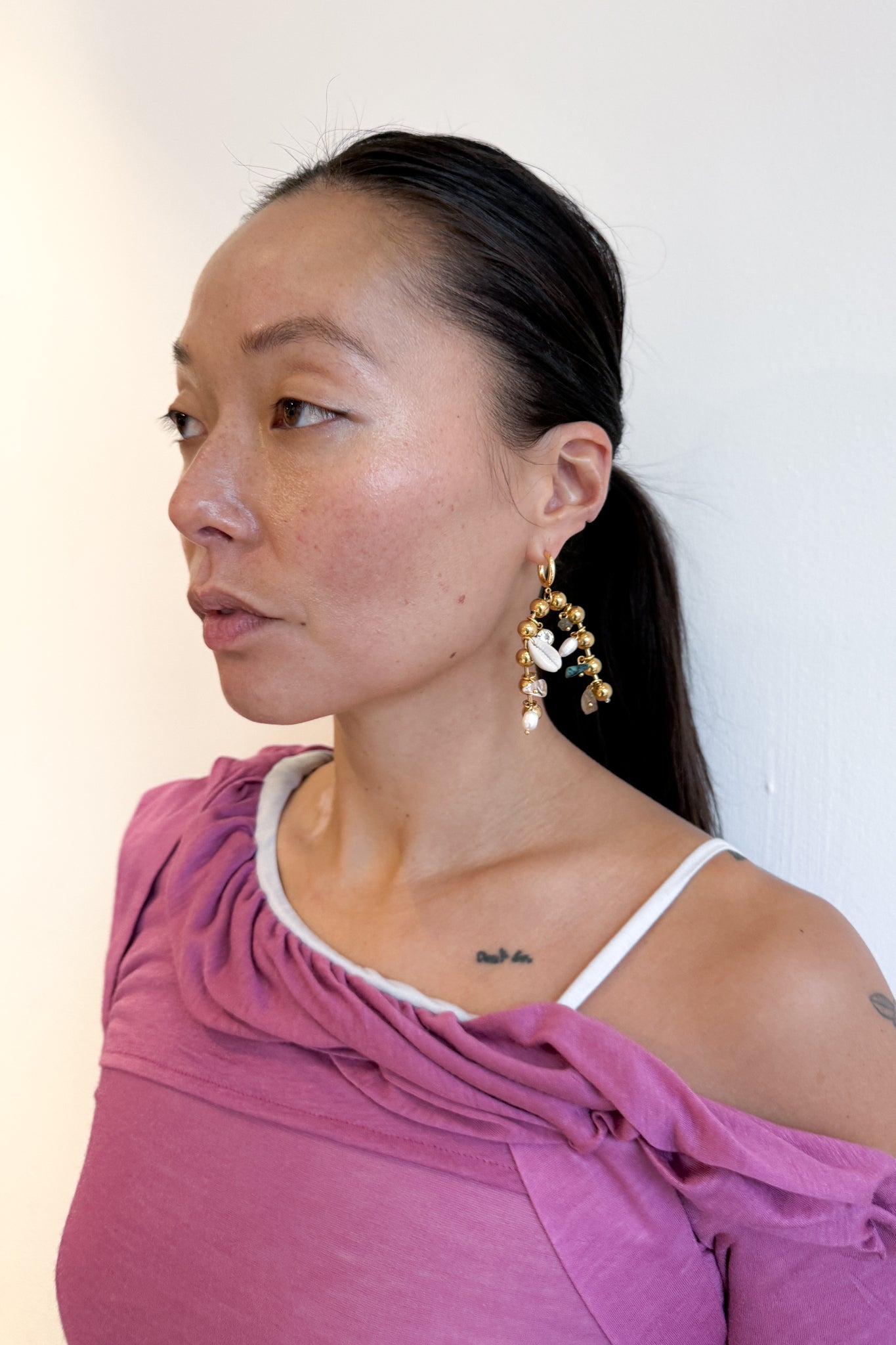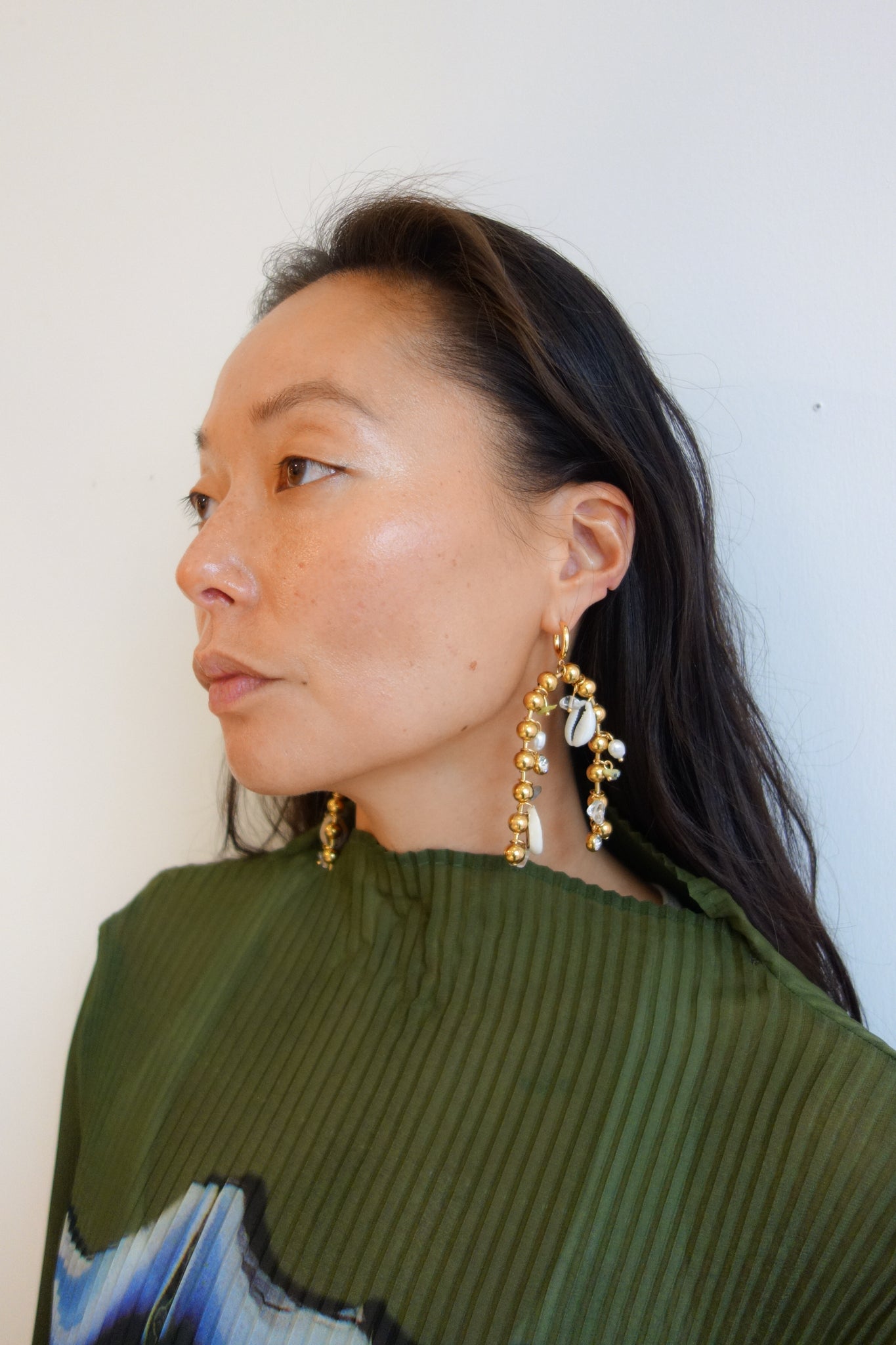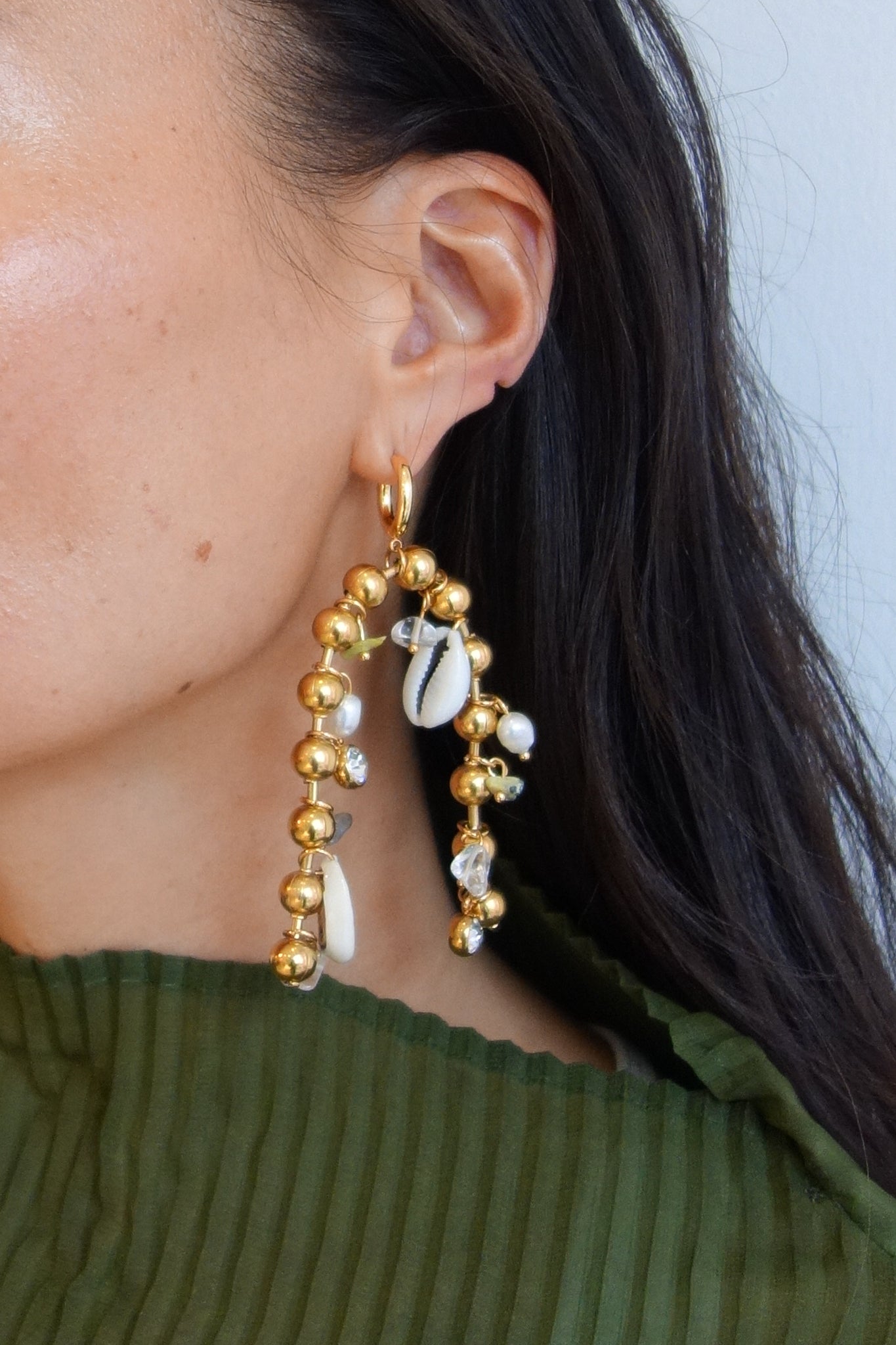 316L stainless steel with 18k gold plating, ball chain earrings with adorned cowry shells.