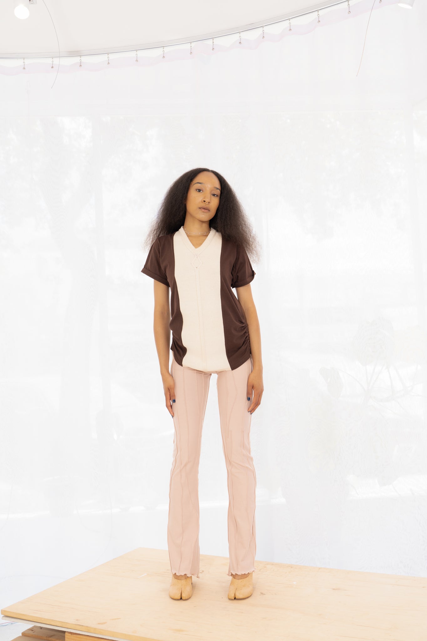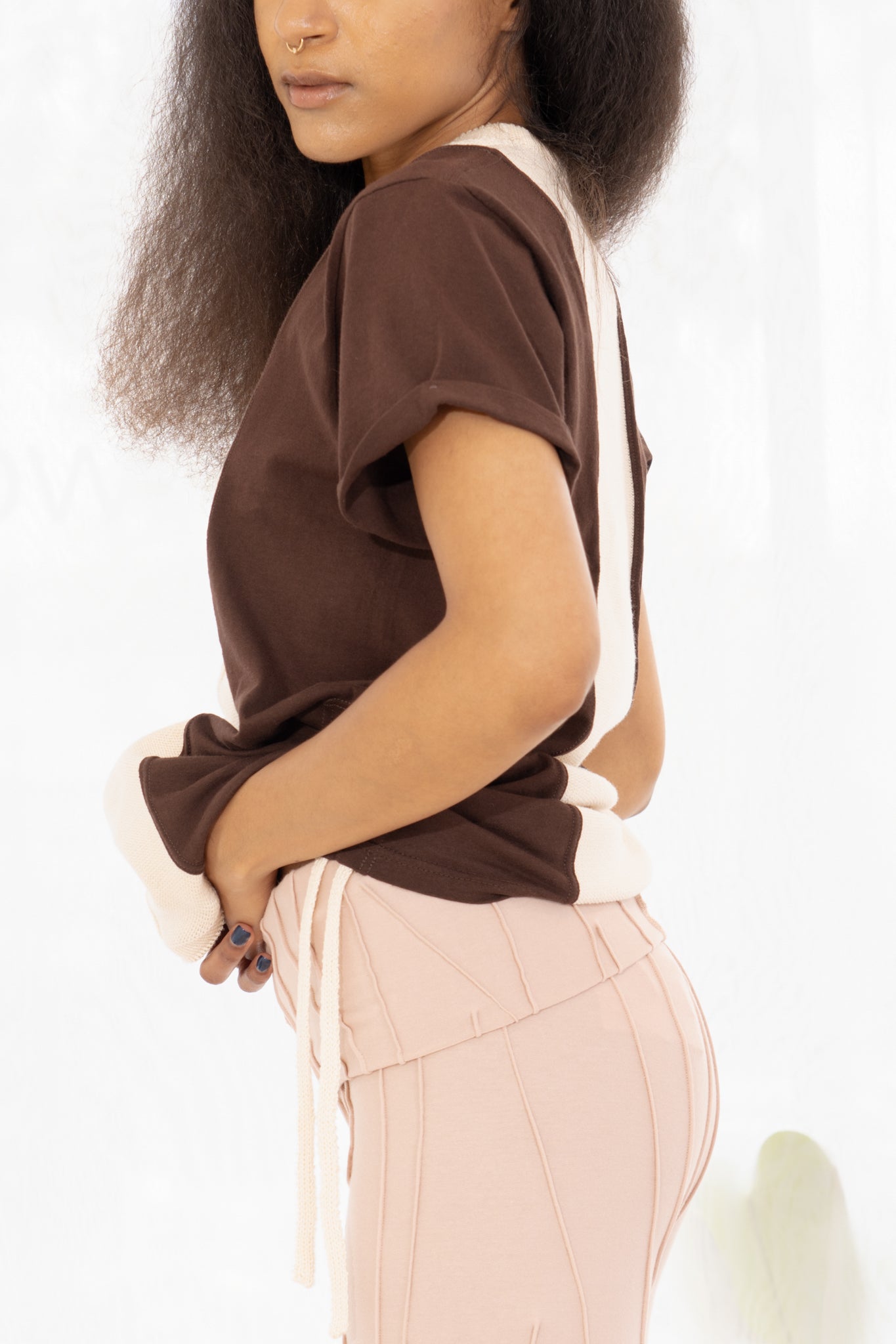 V-neck short sleeve t-shirt bodice with center knitted panel, featuring the collections signature aran diamond. Drawstrings placed along the sides allowing the shirt to be shirred and raise the hem at sides.