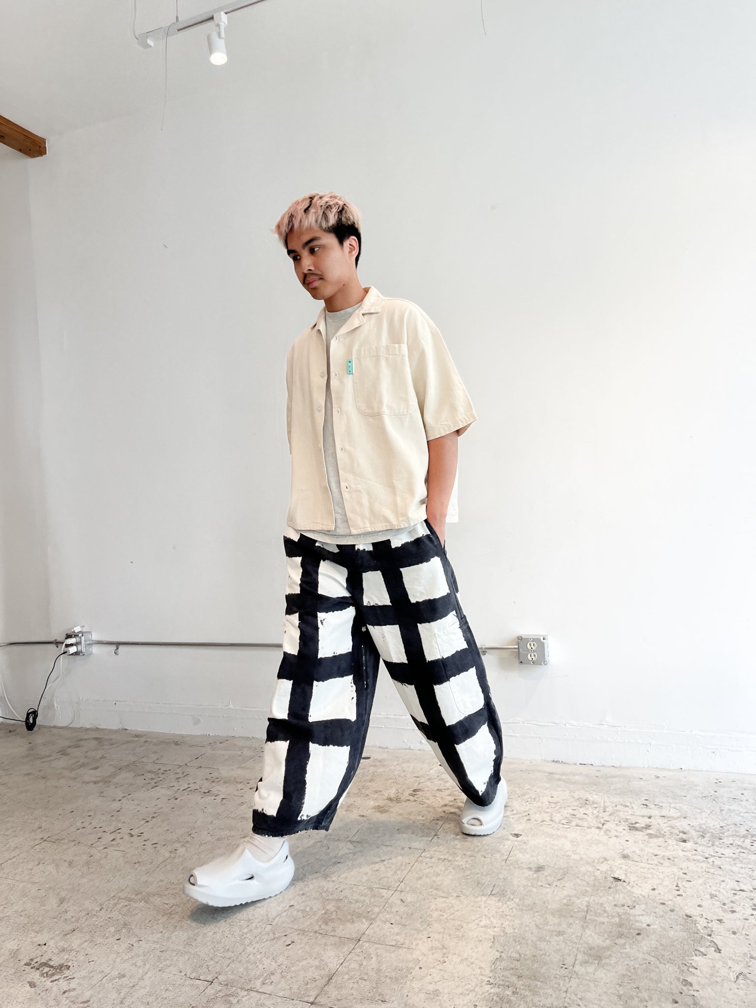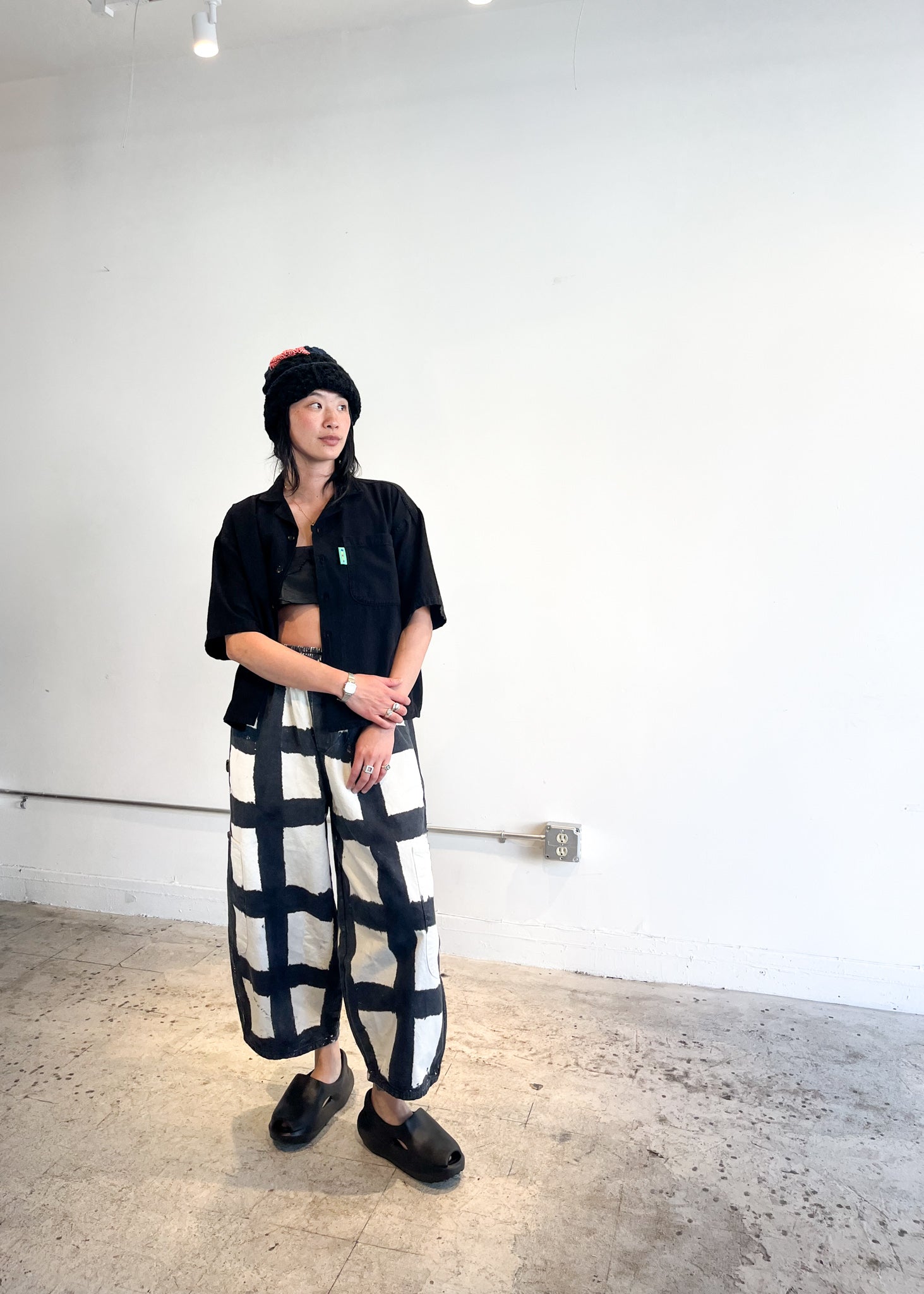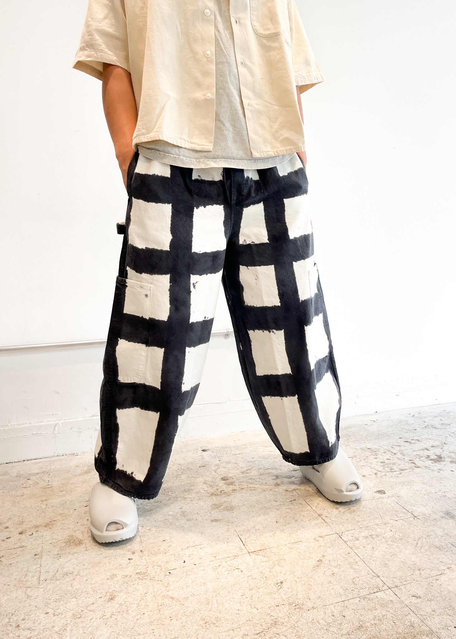 Wide leg pants in checks with 5 big pockets. Elastic waist + drawstring. Made in LA.