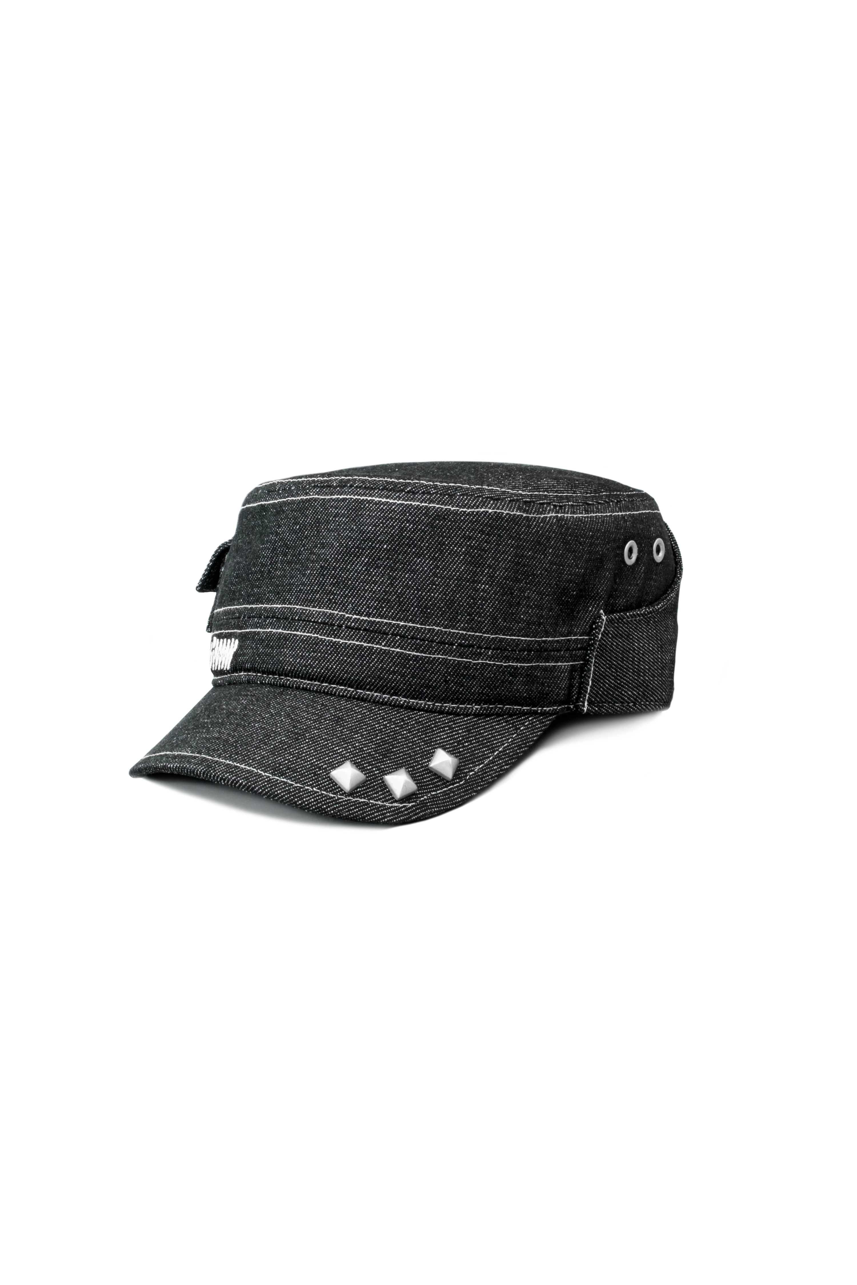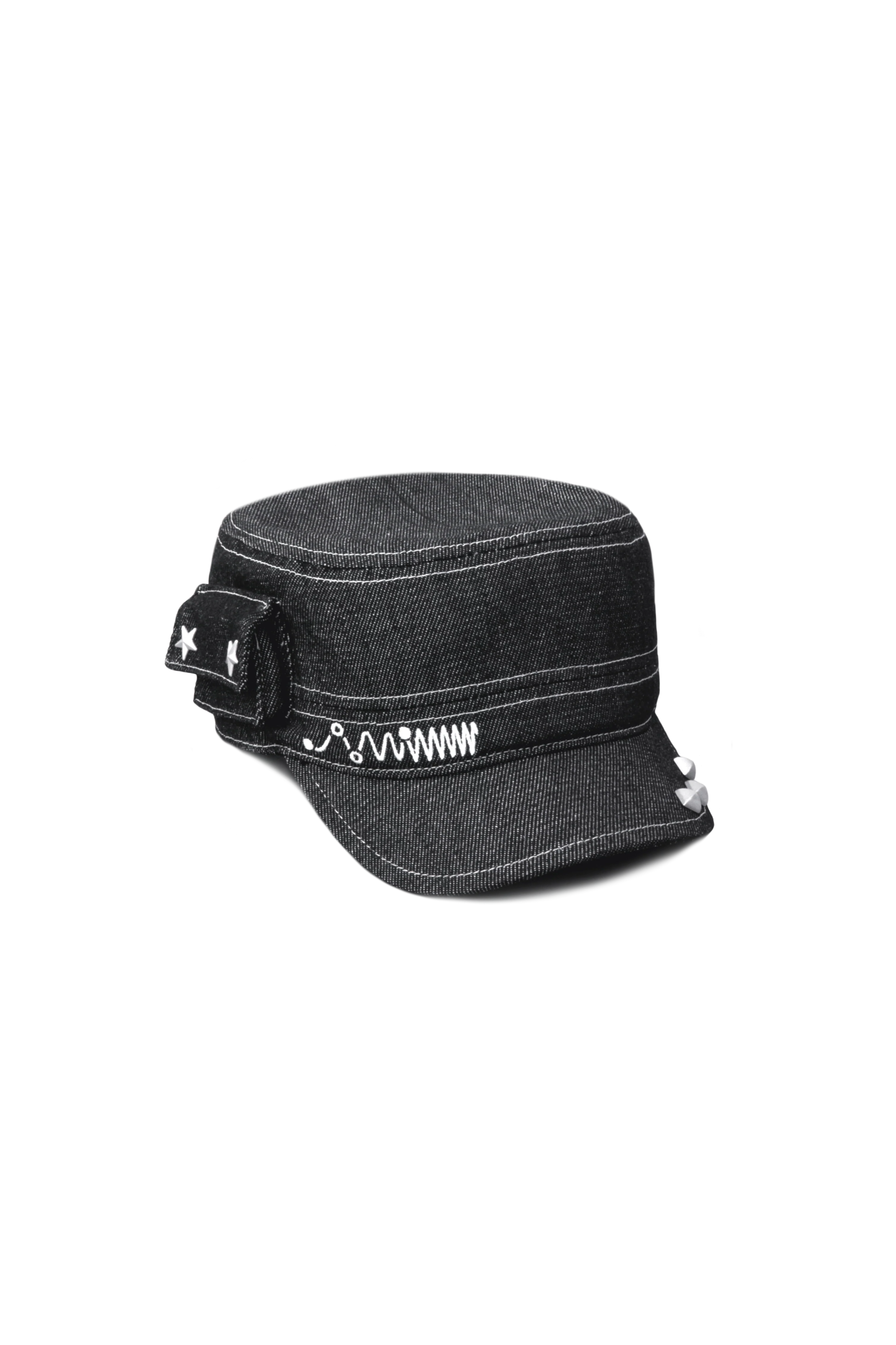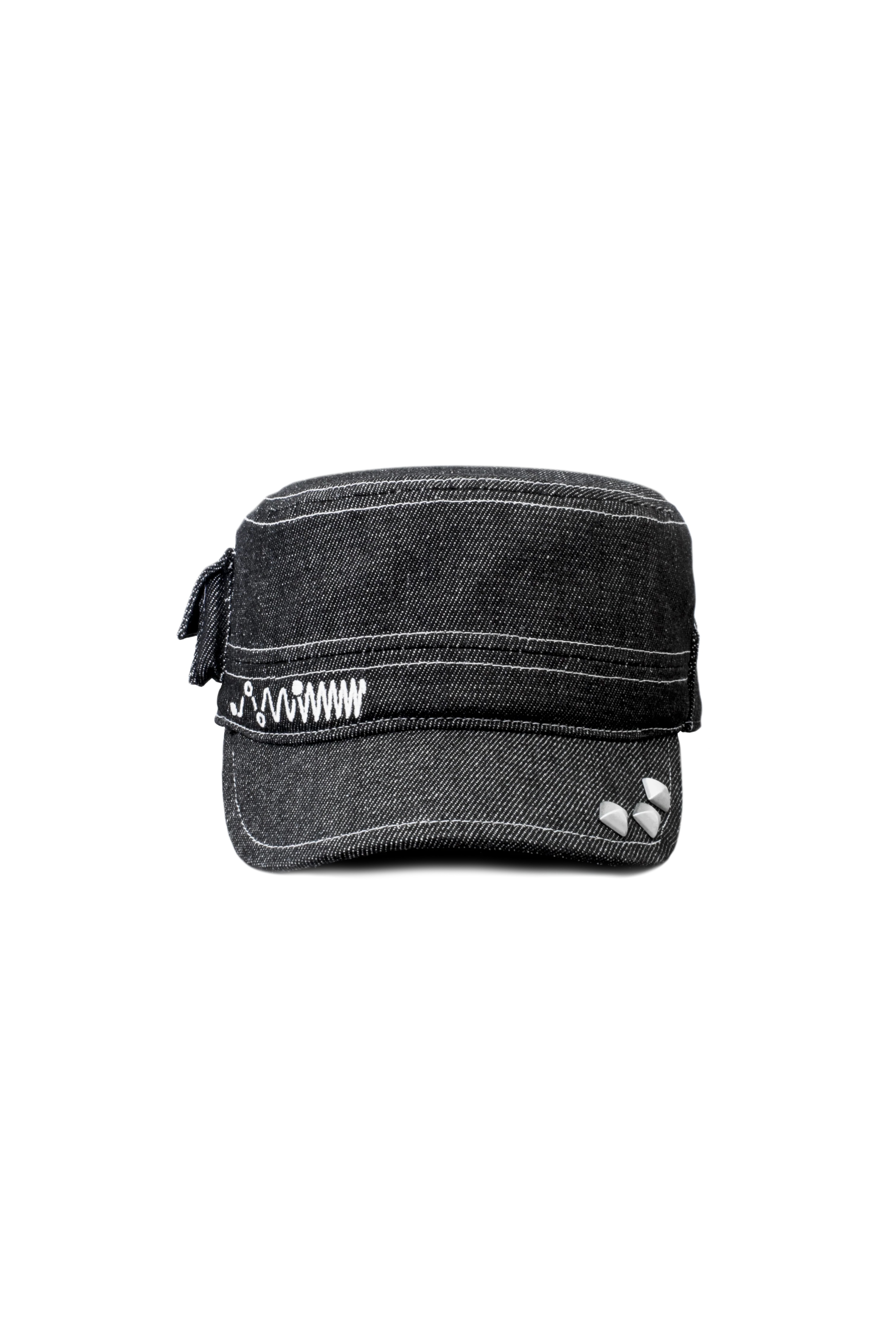 Structured denim cap reminiscent of painter’s hats, with a flat crown and short brim.