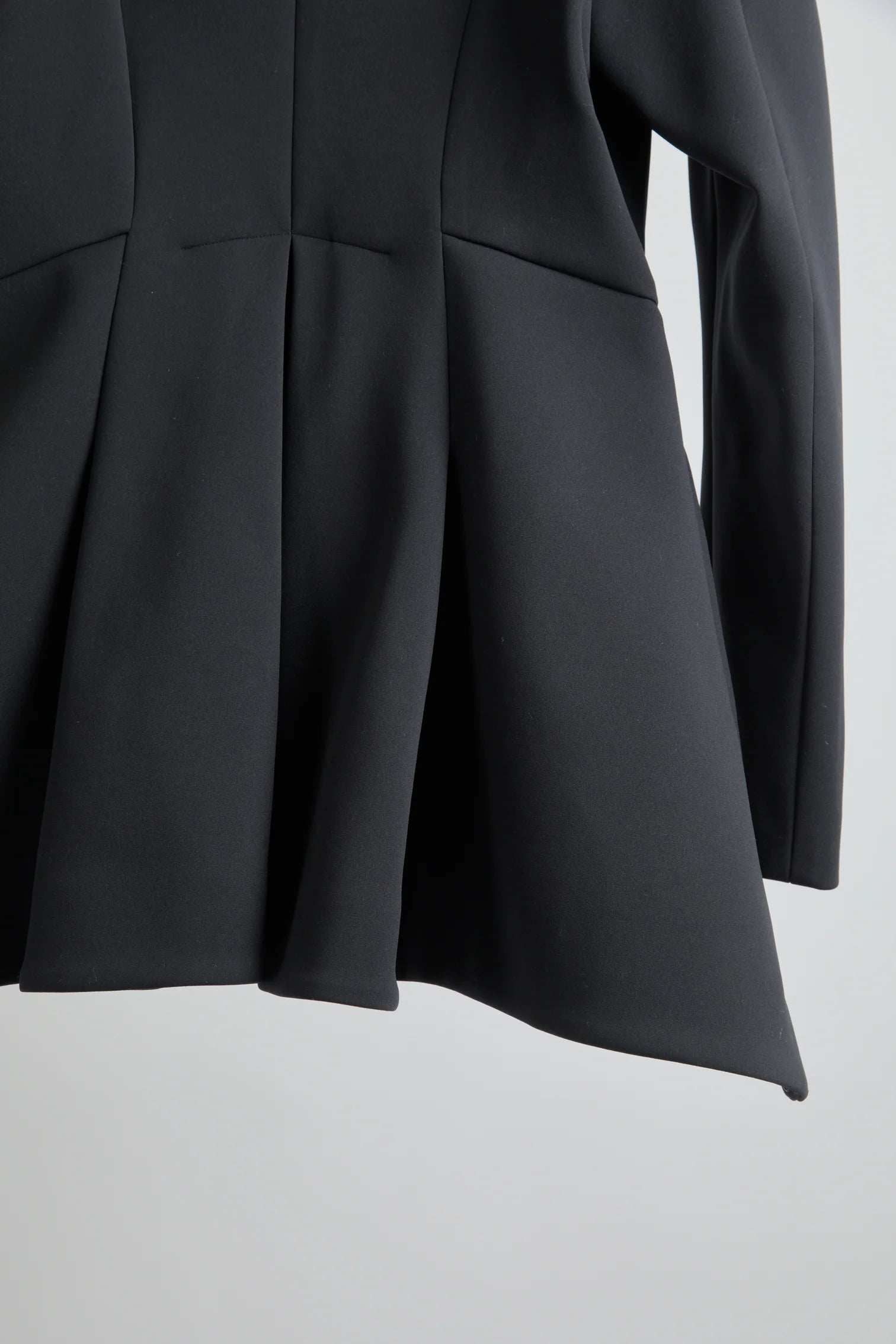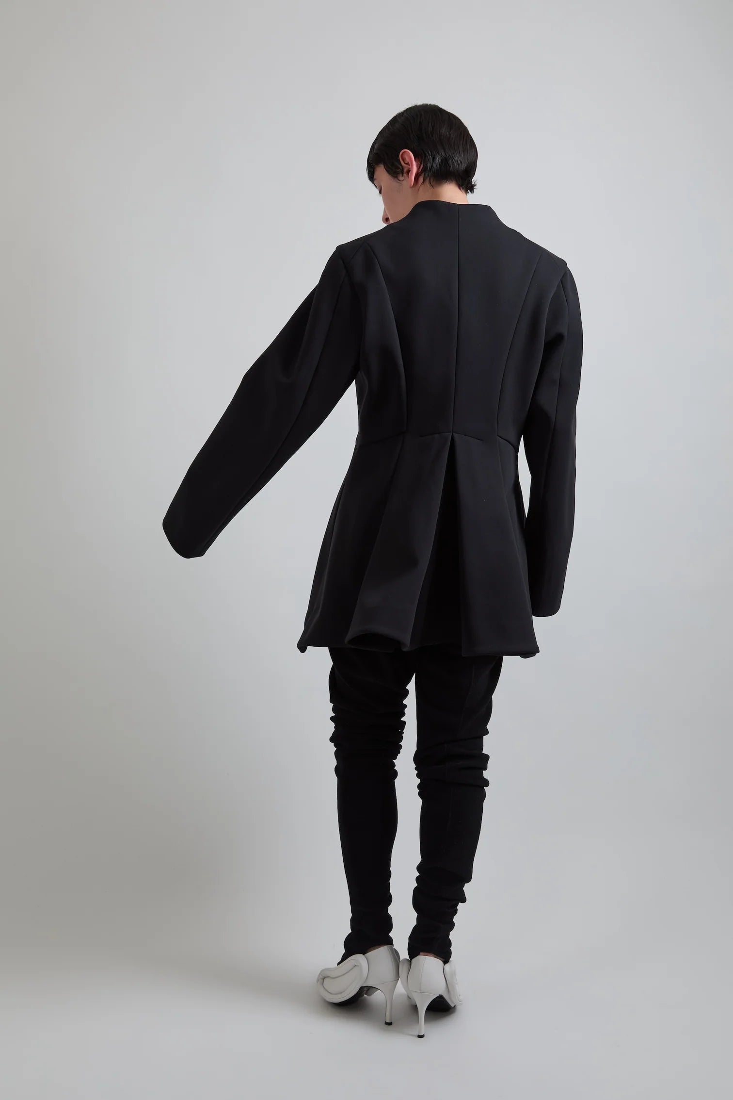 This is an oversized version of the women's jacket presented as the uniform for the “Sumitomo Pavilion” at Expo Kansai, Osaka. It features large pleat like wings. The sculptural shape is achieved with a scuba material that is firm and taut.