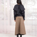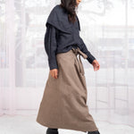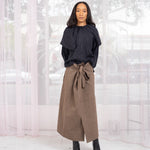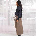 Straight a-line brown skirt with adjustable wrap waist ties. Two large pockets. Skirt can be worn with pockets at back or in front. Front slit.