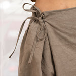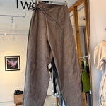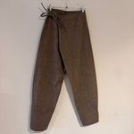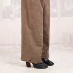 Wide leg brown pant with adjustable leg opening, creating a balloon effect or straight leg. Hand sewn button holes, a tailoring technique rarely done outside of traditional suiting ateliers. Two large pockets at back.
