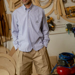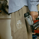 Chino shorts in collaboration with Brooks Brothers. Featuring the Brain Dead x Brooks Brothers logohead embroidered on the leg and exaggerated pleating. Structured, yet airy. Can be styled casually or dressed up.